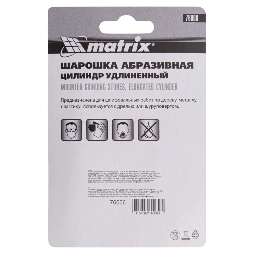 Шарошка абразивная Matrix 76006, 25 х 38 мм, с хвостовиком диаметром 6 мм, 3шт., имеет форму удлиненного цилиндра и покрыта крупнозернистым абразивом F46. Предназначена для очистки прямолинейных поверхностей, расширения отверстий, снятия фасок и удаления заусенцев. Она используется в качестве оснастки на дрелях, шуруповертах, а также ПШМ при выполнении отделочных и декоративных работ.ПреимуществаАбразив из оксида алюминия универсален по своему применению, поэтому подходит для обработки различных поверхностей: металла, пластика, древесины, минеральных материалов.Крупнозернистый абразив F46 позволяет осуществить грубую шлифовку заготовок.Комплект состоит из 3 шарошек, которых хватит на большой объем работ.