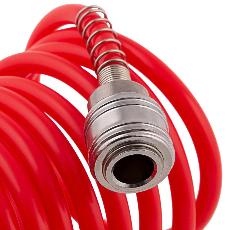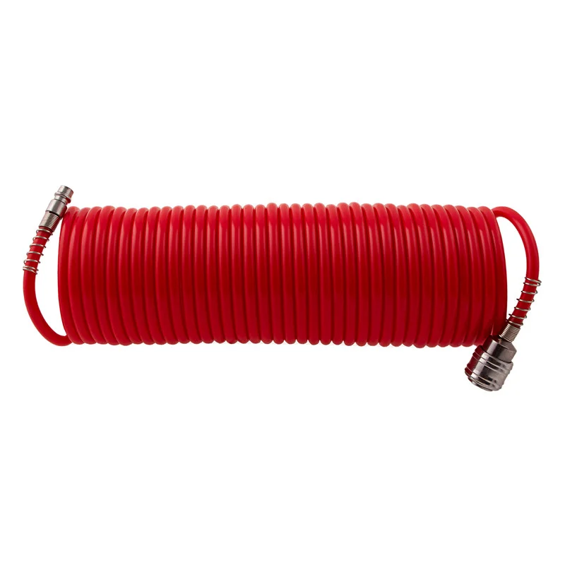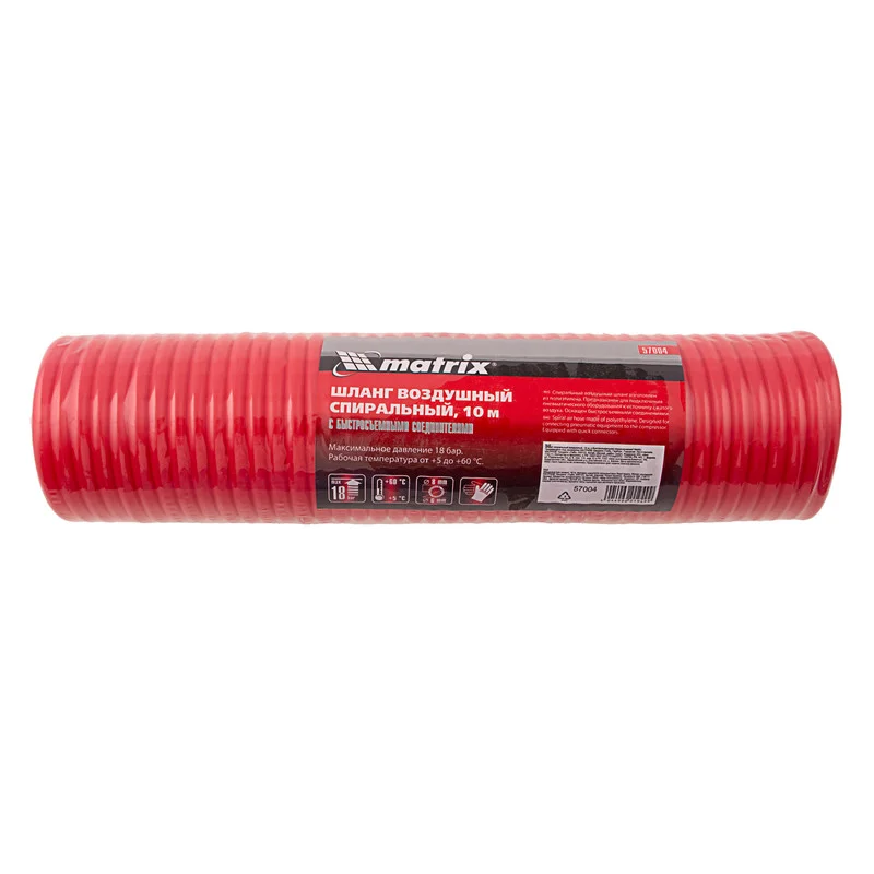 Спиральный воздушный шланг Matrix 57004 длиной 10 м, с быстросъемными соединениями, используется для подключения пневмоинструментов к компрессору. Изготовлен из легкого полиэтилена, за счет чего даже длительная работа не вызывает усталости. Имеет форму спирали, поэтому его не нужно скручивать после работы. Рукав пригодится в автосервисе, слесарной мастерской, а также во время отделочных работ.Преимущества Быстроразъемное соединение ускоряет подключение пневмоинструментов, что экономит время и силы мастера. Максимальное давление составляет 18 бар, что позволяет использовать шланг с мощным компрессорным оборудованием. Соединители имеют антикоррозийное покрытие, поэтому не ржавеют и служат долго. Увеличенная толщина шланга повышает сопротивляемость нагрузкам, устойчивость к высокому давлению и механическим воздействиям.