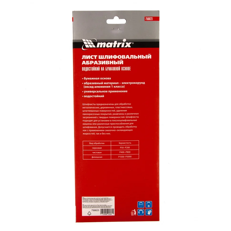 Шлифлист Matrix 756623 размером 115 х 280 мм оптимален для промежуточной обработки. Устанавливается в плоскошлифовальную машину, а также различные шлифовальные приспособления, либо применяться для ручной обработки. Среднезернистый электрокорунд Р100 способен справиться со слоем эмали, лака, краски, удалением налета ржавчины и загрязнений, подготовкой поверхности к отделке.ПреимуществаУниверсальность — шлифлист предназначен для обработки различных поверхностей: деревянных, металлических, пластмассовых, шпаклеванных, в том числе подготовленных под отделку и покраску.Абразив из оксида алюминия 1-го класса — твердые крупицы заостренной формы обеспечивают высокую скорость обработки.Возможность обработки неровных поверхностей — бумажная основа в сочетании с тонкой структурой листа обеспечивают высокую чувствительность к рельефу поверхности.Водостойкость — шлифлист может использоваться для сухой и мокрой обработки поверхностей.Удобная упаковка — набор состоит из 5 штук.