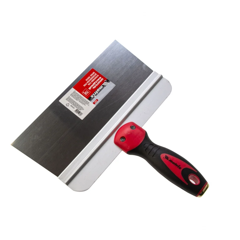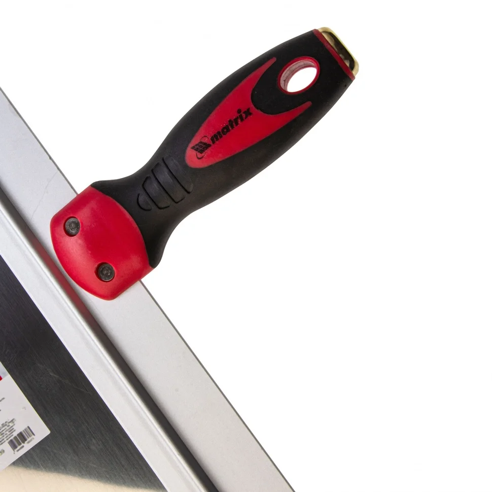 Фасадный шпатель Matrix 85529 из нержавеющей стали, с широким полотном 250 мм и 2-компонентной ручкой, используется для нанесения и выравнивания поверхностей с помощью растворов, нанесения декоративных штукатурок и т.д. Позволяет решить как бытовые, так и профессиональные задачи на строительной площадке.ПреимуществаРабочее полотно из высококачественной нержавеющей стали устойчиво к износу и образованию коррозии, а также легко очищается после окончания работ.Алюминиевое ребро жесткости повышает устойчивость рабочего полотна к деформации и рабочий ресурс инструмента.За счет ширины полотна 25 см удобно набирать большое количество смеси.Эргономичная двухкомпонентная рукоятка обеспечивает удобный захват шпателя и предотвращает его проскальзывание в ладони.В рукоятке имеется отверстие для организации подвесного хранения.
