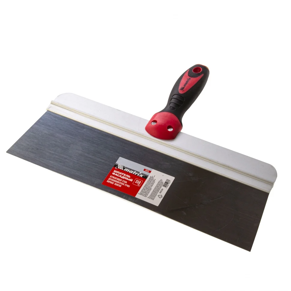 Фасадный шпатель Matrix 85539 из нержавеющей стали, с широким полотном 350 мм и 2-компонентной ручкой, используется для нанесения и выравнивания поверхностей с помощью растворов, нанесения декоративных штукатурок и т.д. Позволяет решить как бытовые, так и профессиональные задачи на строительной площадке.ПреимуществаРабочее полотно из высококачественной нержавеющей стали устойчиво к износу и образованию коррозии, а также легко очищается после окончания работ.Алюминиевое ребро жесткости повышает устойчивость рабочего полотна к деформации и рабочий ресурс инструмента.За счет ширины полотна 35 см удобно набирать большое количество смеси.Эргономичная двухкомпонентная рукоятка обеспечивает удобный захват шпателя и предотвращает его проскальзывание в ладони.В рукоятке имеется отверстие для организации подвесного хранения.