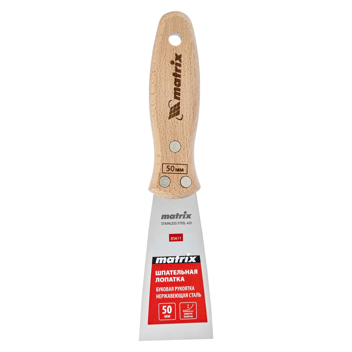 Шпательная лопатка Matrix 85611 с полотном из нержавеющей стали шириной 50 мм и буковой рукояткой предназначена для работы со строительными растворами. Применяется для нанесения различных смесей на поверхности, шпатлевания трещин и неровностей.