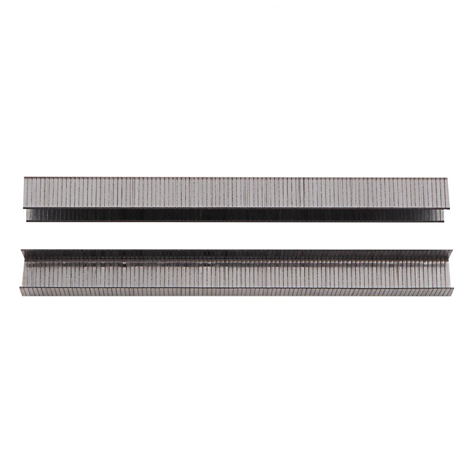 Скобы Matrix 57656 шириной 11,2 мм, 5000 шт. в упаковке, можно использовать с мебельными и строительными пневматическими степлерами, работающими с крепежом размером 10 х 1,2 х 0,6 мм. Они применяются для крепления плинтусов, тканей, пленки и других материалов к деревянным поверхностям.ПреимуществаПрочность и коррозионная стойкость — скобы изготовлены из стали твердостью 310 HV и имеют предел прочности при растяжении 1100 Н/мм, а никелевое покрытие защищает их от воздействия влаги.Эффективная работа — скобы с заостренными концами легко пробивают даже твердые материалы.Продуманная комплектация — крепежи, склеенные в блоки, не рассыпаются, а упаковки из 5000 шт. хватит надолго.
