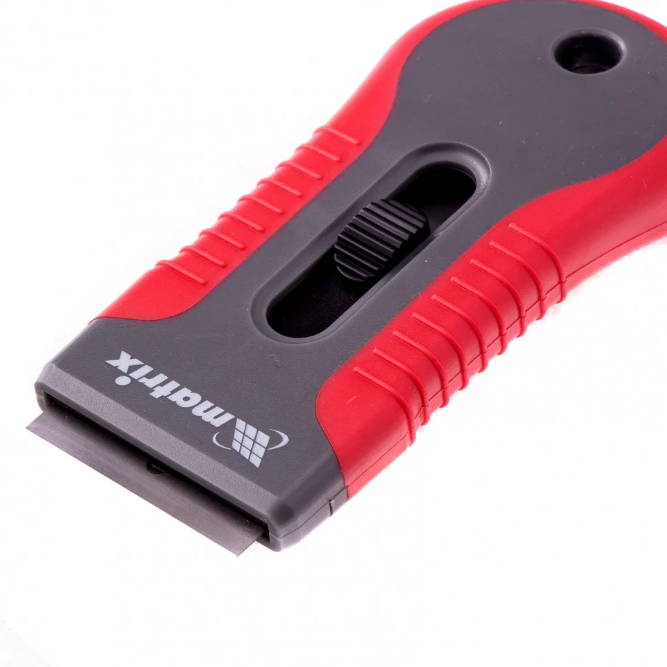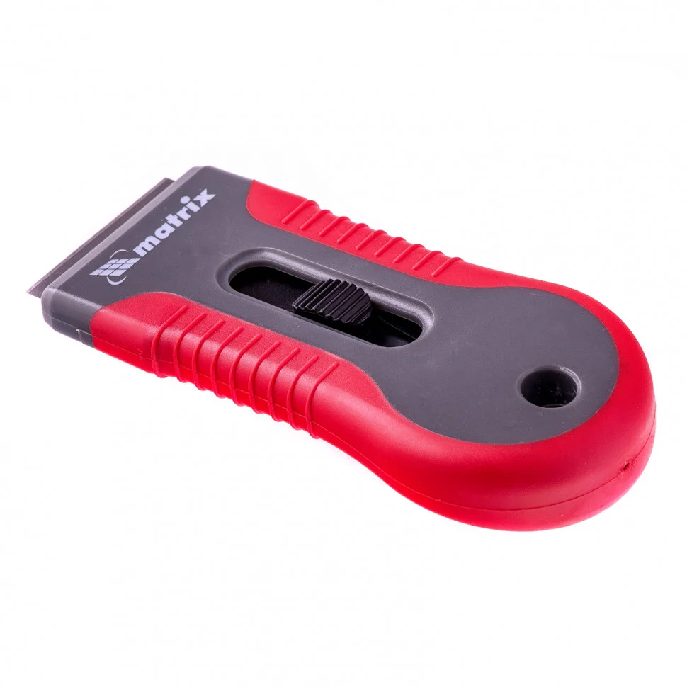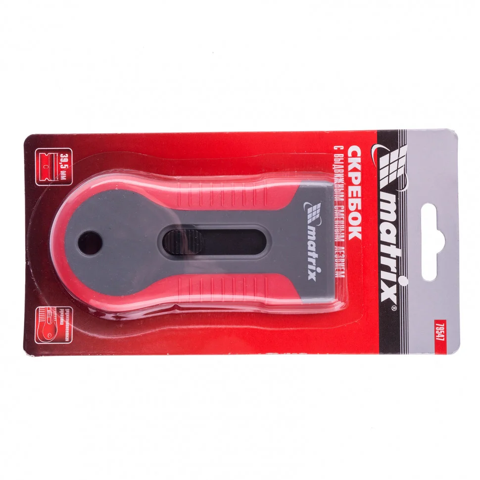 Скребок Matrix 79547 с двухкомпонентной рукояткой и выдвижным сменным лезвием упрощает удаление старых лакокрасочных покрытий, остатков строительных смесей и других загрязнений. Подходит для очищения стеклянных и керамических поверхностей, а также затирки и выравнивания швов. В нерабочем положении лезвие скрыто в корпусе, поэтому инструмент безопасен во время хранения и транспортировки. Скребок пригодится мастерам по ремонту и отделке, а также будет полезен в быту.ПреимуществаМеталлическое лезвие из углеродистой стали обладает высоким ресурсом работоспособности.Прочный пластиковый корпус рассчитан на длительное использование.Съемное лезвие можно заменить в случае износа.На корпусе имеются прорезиненные вставки, поэтому инструмент не выскальзывает из ладони.