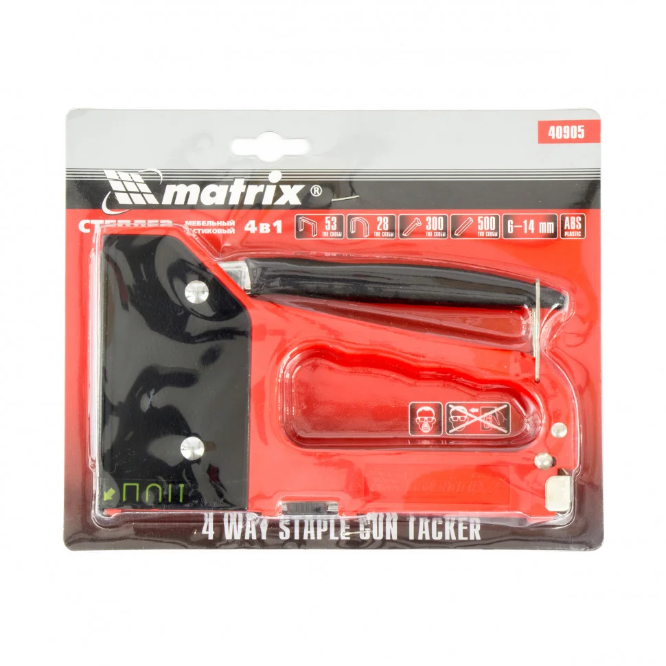 Мебельный 4-функциональный степлер Matrix 40905 используется для крепежных работ и совместим со скобами наиболее востребованных типов — 53 размером 6-14 мм, 300 и 500 размером 14 мм, а также полукруглыми скобами 28 типа размером 12 мм. Благодаря этому инструмент универсален и может использоваться для крепления к деревянным основаниям различных материалов — фанеры, ДСП, ДВП, оргалита, пленки или утеплителя. Пригодится для сборки и обивки мебели, укладки напольных покрытий, прокладки низковольтных кабелей, а также для отделочных и багетных работ.ПреимуществаКорпус из ударопрочного ABS-пластика характеризуется износостойкостью и долговечностью.Эргономичная рукоятка обеспечивает надежный хват и повышает комфортность работы.Металлическая скоба надежно фиксирует рукоятку в нерабочем положении, обеспечивая безопасность хранения и транспортировки степлера.Инструмент изготовлен на тайваньском заводе с соблюдением всех технологических норм, что гарантирует его высокое качество.
