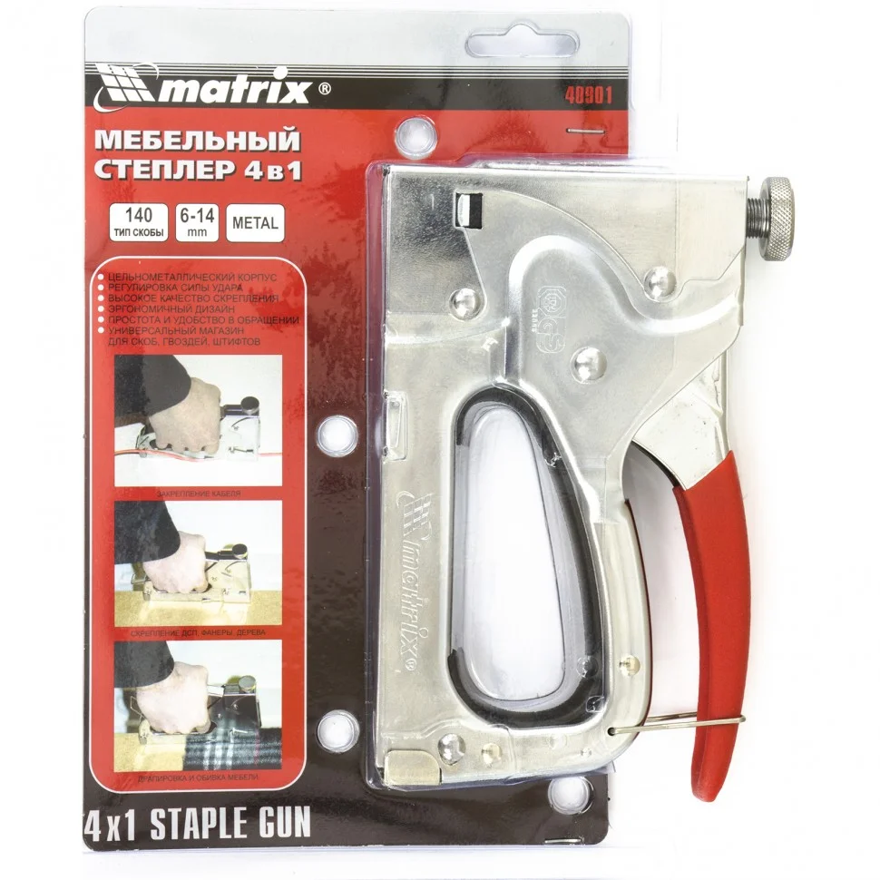 Мебельный 4-функциональный степлер Matrix 40901 имеет универсальный механизм, совместимый со скобами типов 140, 36, 300 и 500 размером 6-14 мм, поэтому его можно использовать не только для сборки и обивки мебели, но и для укладки ковровых покрытий, монтажа низковольтных кабелей, а также багетных работ. Инструмент предназначен для закрепления фанеры, картона, ДВП, ДСП, пленки и утеплителя на деревянном основании. Степлер устойчив к нагрузкам благодаря штампованному стальному корпусу.ПреимуществаПлавная регулировка силы удара позволяет контролировать глубину забивания скоб, а запас мощности облегчает работу с материалами из древесины твердых пород.Корпус имеет хромированное покрытие, защищающее его от образования коррозии.Для фиксации рукоятки предусмотрена накидная скоба, предотвращающая случайное срабатывание степлера во время хранения или транспортировки.Инструмент изготовлен в Тайване под строгим контролем качества, что гарантирует его надежность.