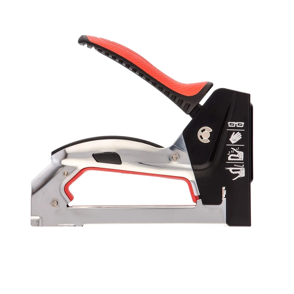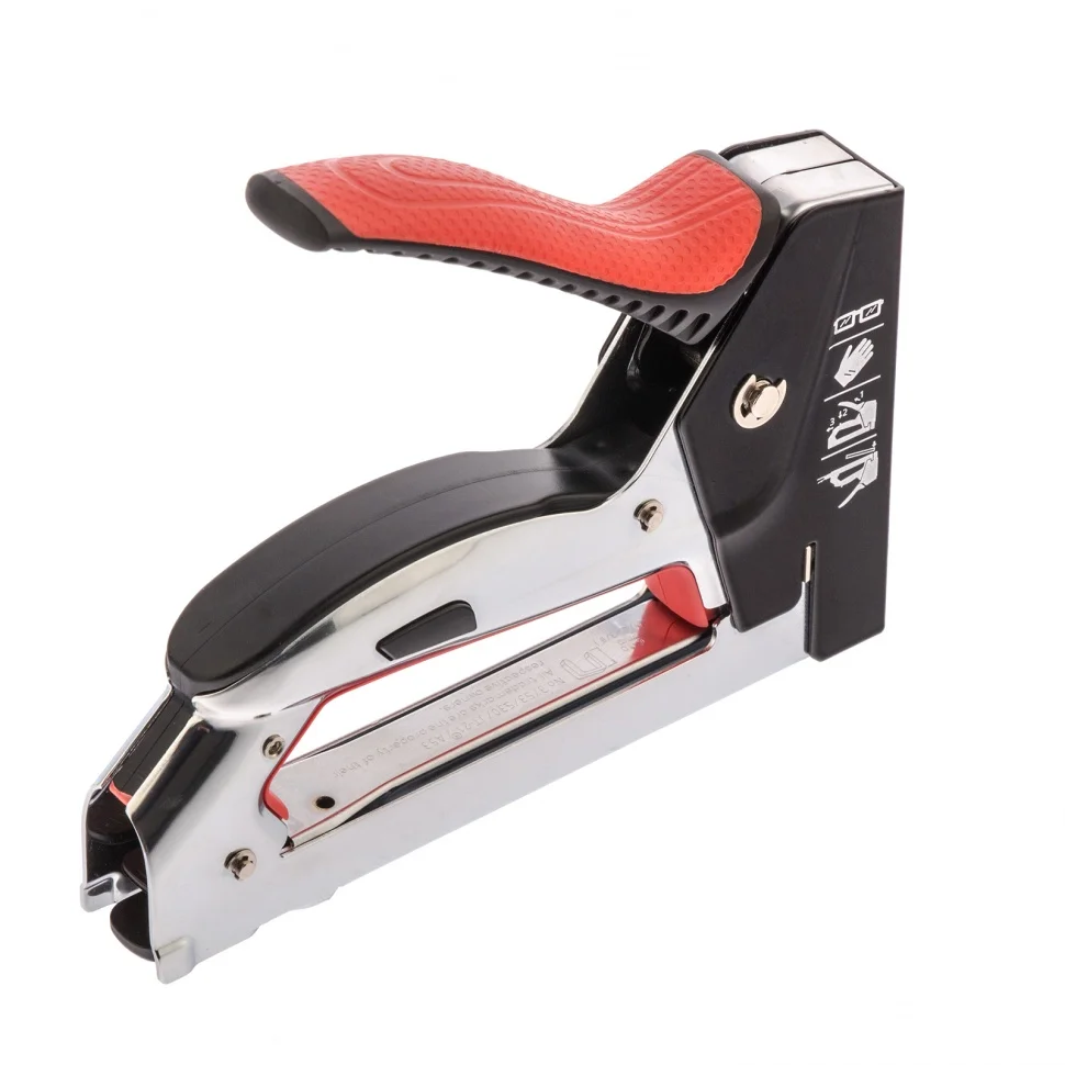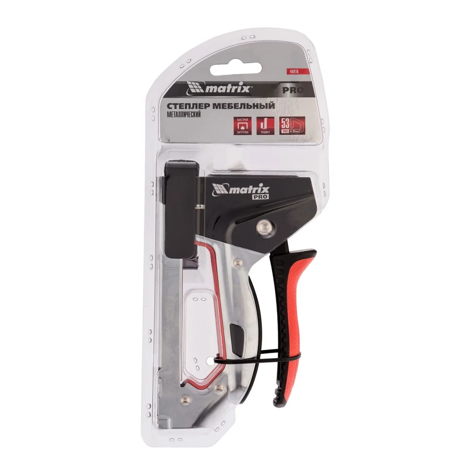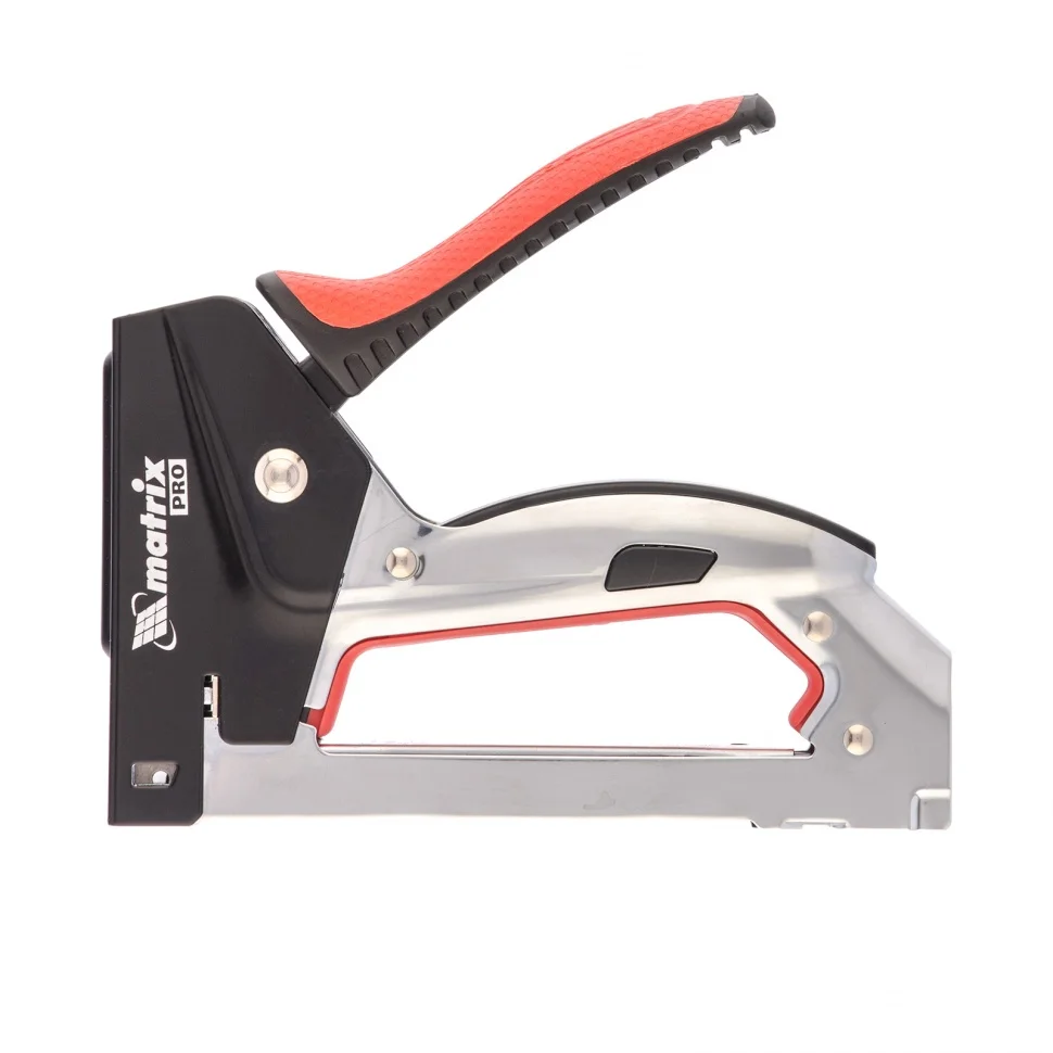 Стальной мебельный степлер Matrix PRO 40916 с быстрой загрузкой совместим со скобами типа 53 размером 6-10 мм и позволяет быстро зафиксировать на деревянном основании фанеру, оргалит, ДВП, ДСП, пленку ПВХ или изоляционный материал. Механизм быстрой загрузки скоб экономит время мастера. Инструмент поставляется с крючком для подвешивания на ремень. Степлер используют для обивки или сборки мебели, проведения теплоизоляционных и отделочных работ, укладки ковровых покрытий.ПреимуществаПрочность — стальной корпус, изготовленный методом штамповки, устойчив к повреждениям.Долговечность — хромированное покрытие и порошковая эмаль защищают корпус от ржавчины.Комфорт во время работы — эргономичная двухкомпонентная рукоятка с рельефным дизайном не скользит в руке.