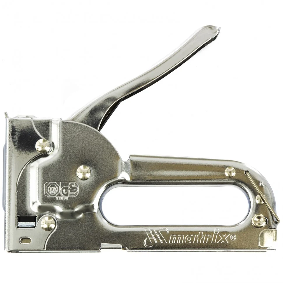 Мебельный степлер Matrix 40903 работает со скобами типа 53 размером 4-8 мм и предназначен для фиксации на деревянном основании тонких листовых материалов — оргалита, ДВП, ДСП, фанеры, пленки или утеплителя. Будет полезен в быту для перетяжки мебели или сборки шкафов.ПреимуществаКорпус изготовлен из высококачественной инструментальной стали, что обеспечивает инструменту долгий срок службы.Хромированное покрытие защищает поверхность корпуса от образования коррозии.Конструкцией предусмотрена металлическая скоба для фиксации рукоятки в нерабочем положении, обеспечивающая безопасность хранения и транспортировки.Степлер изготовлен на тайваньском заводе, оснащенном высокотехнологичным оборудованием, и имеет необходимые сертификаты безопасности.