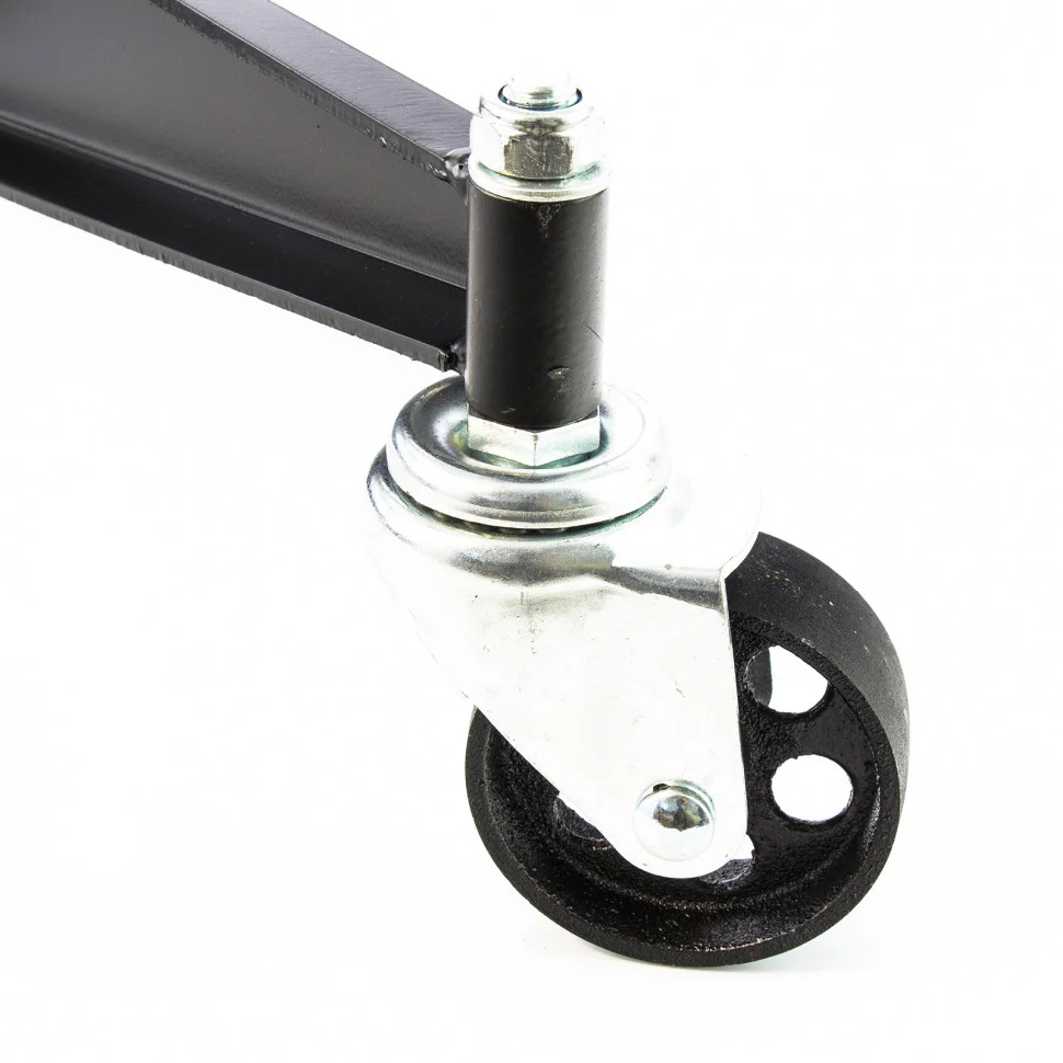 - Для удобства перемещения стойки по рабочей площадке предусмотрены колеса, а для ее надежной фиксации на месте — стопорные педали.