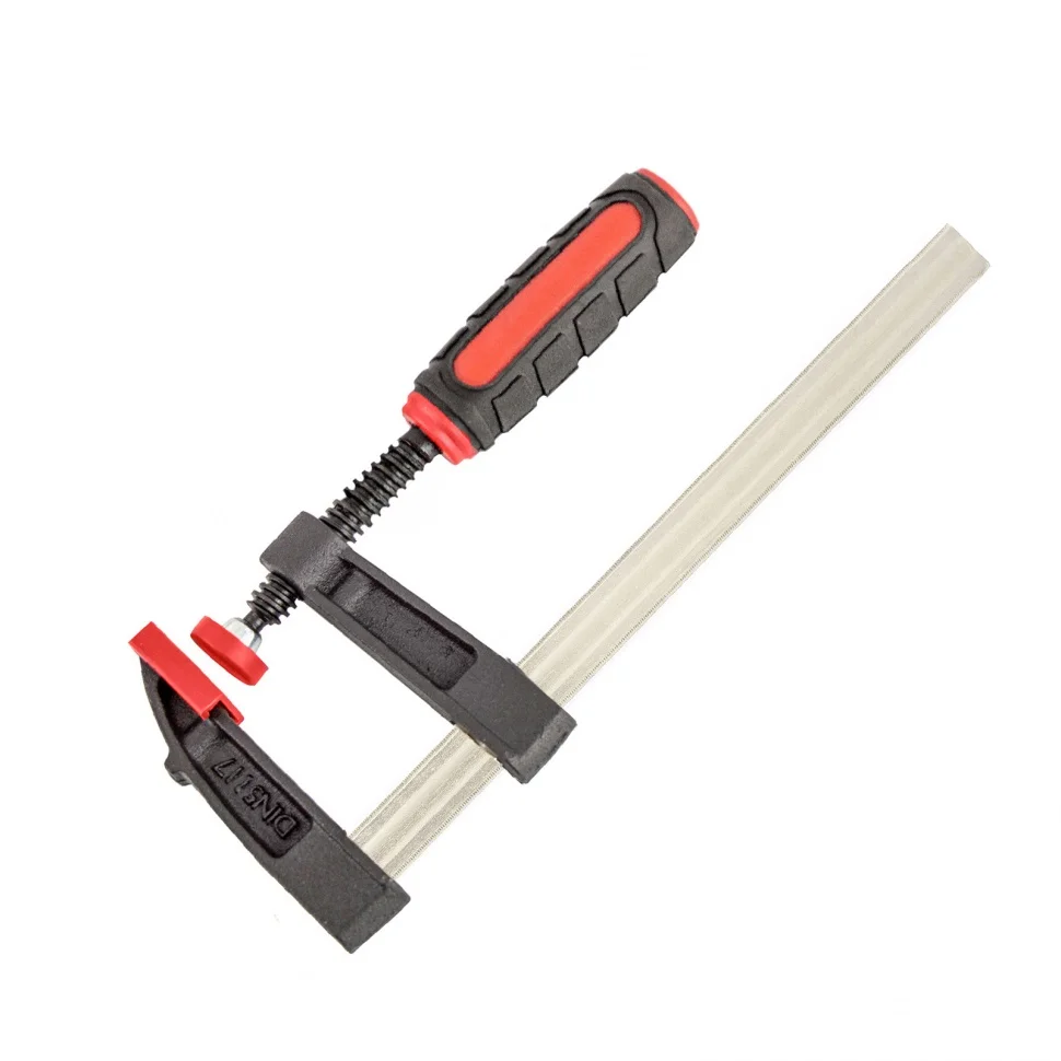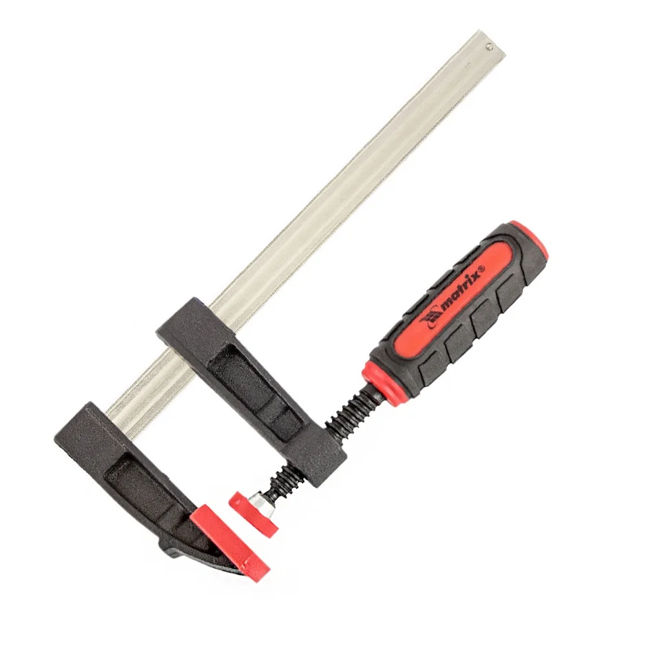 F-образная струбцина Matrix 20402, 150 х 50 х 210 мм, используется для зажима металлических, деревянных и других заготовок для их последующей обработки или сборки. Представляет собой штангу, на которой установлены 2 кронштейна — неподвижный и подвижный. Деталь помещается между ними и прижимается к губкам при помощи винтового зажима с трапециевидной резьбой. Величина захвата может достигать 150 мм, она регулируется при помощи подвижного кронштейна. Струбцину применяют при выполнении слесарных и столярных работ. Металлическая конструкция выдерживает высокую температуру, поэтому инструмент пригодится во время сварки, при этом необходимо будет снять пластиковые накладки с губок.ПреимуществаПрочная стальная штанга выдерживает повышенные нагрузки и позволяет фиксировать заготовки со значительным усилием.На губках установлены пластиковые накладки, которые предохраняют поверхность детали от повреждения при сильном сжатии.Эргономичная двухкомпонентная обрезиненная рукоятка имеет рельефный дизайн и не выскальзывает из ладони, обеспечивая комфорт во время работы.