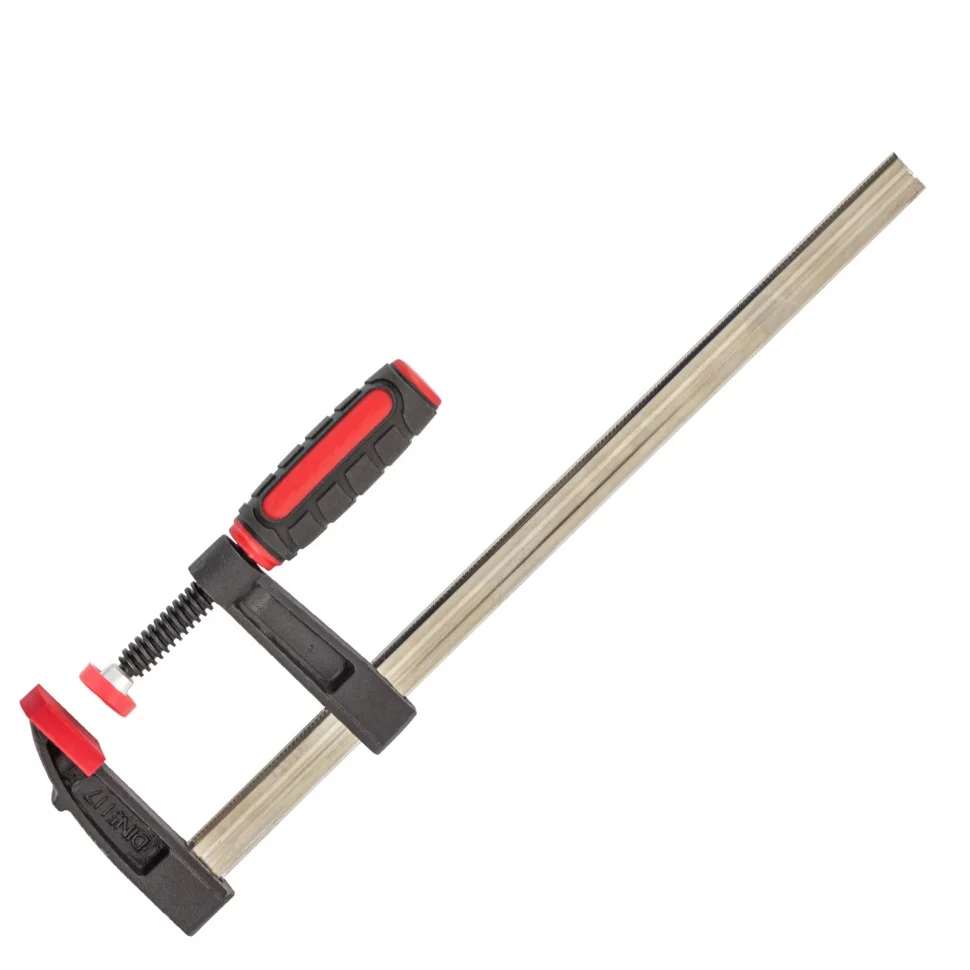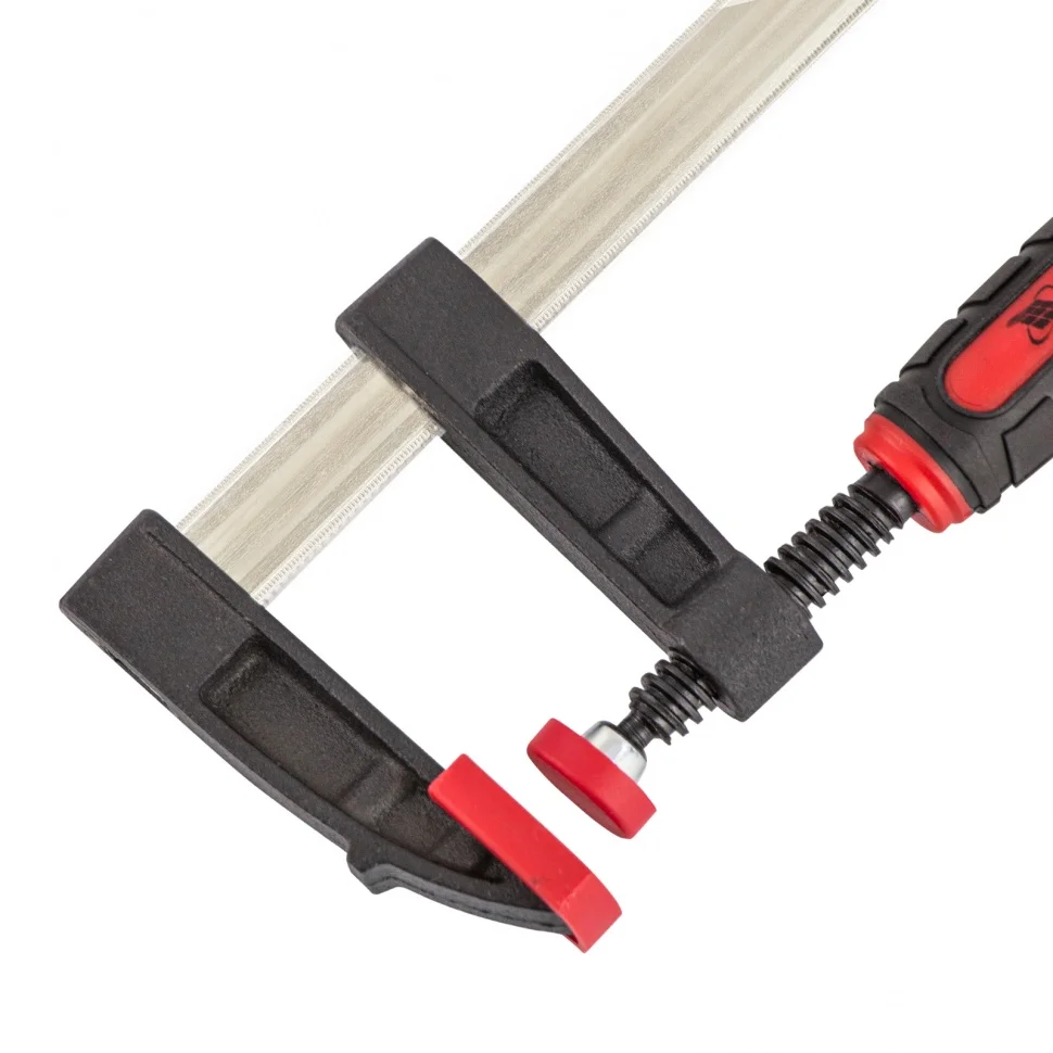 F-образная струбцина Matrix 20404, 250 х 50 х 310 мм, используется для зажима металлических, деревянных и других заготовок для их последующей обработки или сборки. Представляет собой штангу, на которой установлены 2 кронштейна — неподвижный и подвижный. Деталь помещается между ними и прижимается к губкам при помощи винтового зажима с трапециевидной резьбой. Величина захвата может достигать 250 мм, она регулируется при помощи подвижного кронштейна. Струбцину применяют при выполнении слесарных и столярных работ. Металлическая конструкция выдерживает высокую температуру, поэтому инструмент пригодится во время сварки, при этом необходимо будет снять пластиковые накладки с губок.ПреимуществаПрочная стальная штанга выдерживает повышенные нагрузки и позволяет фиксировать заготовки со значительным усилием.На губках установлены пластиковые накладки, которые предохраняют поверхность детали от повреждения при сильном сжатии.Эргономичная двухкомпонентная обрезиненная рукоятка имеет рельефный дизайн и не выскальзывает из ладони, обеспечивая комфорт во время работы.