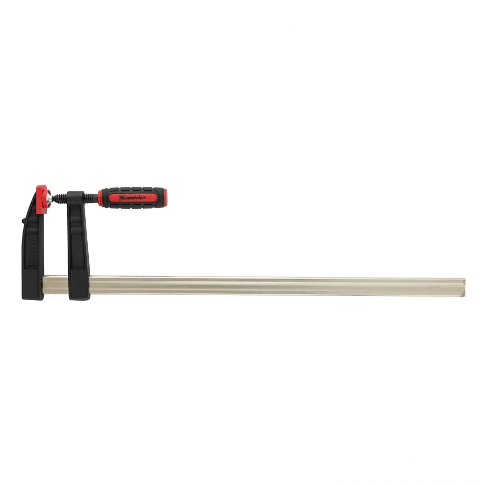 F-образная струбцина Matrix 20417, 600 х 120 х 700 мм, используется для зажима металлических, деревянных и других заготовок для их последующей обработки или сборки. Представляет собой штангу, на которой установлены 2 кронштейна — неподвижный и подвижный. Деталь помещается между ними и прижимается к губкам при помощи винтового зажима с трапециевидной резьбой. Величина захвата может достигать 600 мм, она регулируется при помощи подвижного кронштейна. Струбцину применяют при выполнении слесарных и столярных работ. Металлическая конструкция выдерживает высокую температуру, поэтому инструмент пригодится во время сварки, при этом необходимо будет снять пластиковые накладки с губок.ПреимуществаПрочная стальная штанга выдерживает повышенные нагрузки и позволяет фиксировать заготовки со значительным усилием.На губках установлены пластиковые накладки, которые предохраняют поверхность детали от повреждения при сильном сжатии.Эргономичная двухкомпонентная обрезиненная рукоятка имеет рельефный дизайн и не выскальзывает из ладони, обеспечивая комфорт во время работы.