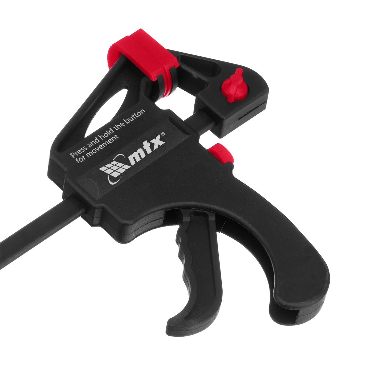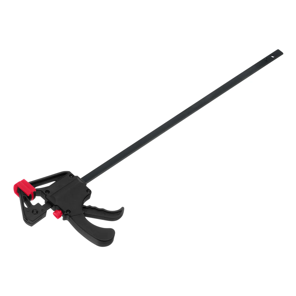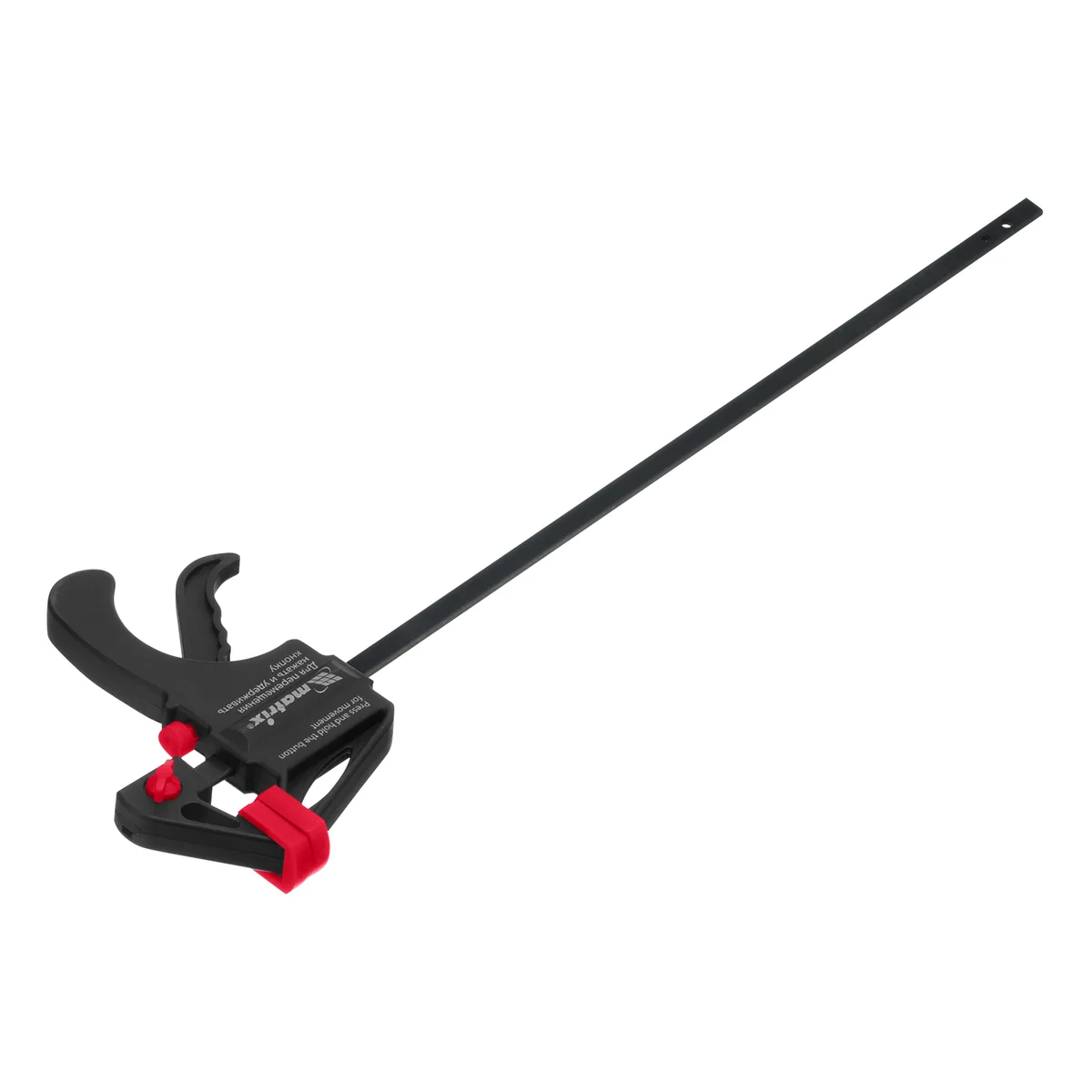 Универсальная F-образная быстрозажимная струбцина Matrix 20573 размером 300 х 415 х 45 мм, в пластиковом корпусе, используется в столярном деле. Позволяет быстро и надежно фиксировать заготовки с целью для последующего склеивания, сверления, шлифовки, пиления и другой обработки. Компактный размер упрощает работу с инструментом.ПреимуществаПростая конструкция — подвижная губка перемещается вдоль штанги при помощи пластинчатого механизма, а фиксатор препятствует разжиманию струбцины.Устойчивость к нагрузкам — направляющая изготовлена из стали и выдерживает значительные усилия при сжатии предметов.Долговечность — рабочие элементы из ударопрочного пластика устойчивы к механическим воздействиям.Аккуратная работа — защитные накладки на губках предохраняют зажимаемые детали от повреждений.Дополнительные возможности — можно установить опорную губку на противоположный конец штанги и использовать струбцину на разжим.