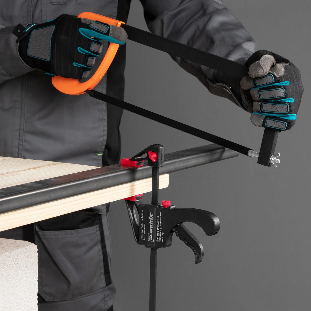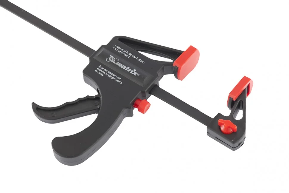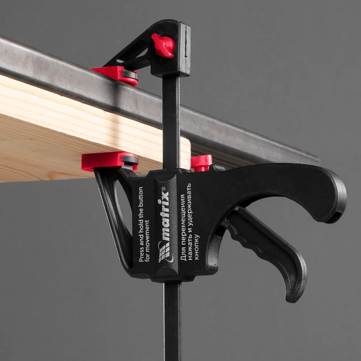 Универсальная F-образная быстрозажимная струбцина Matrix 20561, 150 х 265 х 45 мм, в пластиковом корпусе, используется в столярном деле. Позволяет быстро фиксировать заготовки с целью их соединения или обработки — склеивания, сверления, шлифовки, пиления и других видов работ. Подвижная губка перемещается вдоль штанги при помощи пластинчатого механизма, а фиксатор препятствует разжиманию струбцины. Компактный размер упрощает работу с инструментом.ПреимуществаНаправляющая изготовлена из стали и устойчива к нагрузкам, поэтому выдерживает значительные усилия при сжатии предметов.Рабочие элементы выполнены из ударопрочного пластика и обладают высокой механической стойкостью, что увеличивает срок службы инструмента.Защитные накладки на губках предохраняют зажимаемые детали от повреждений.Опорную губку можно установить на противоположный конец штанги, после чего использовать струбцину на разжим.