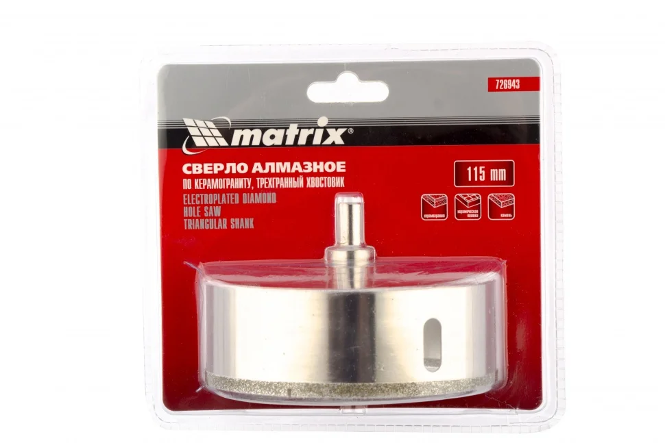 Универсальное алмазное сверло по керамограниту Matrix 726943, 115 х 67 мм, с 3-гранным хвостовиком, применяется для сверления стекла, плитки, кафеля. А за счет высокой концентрации алмазов в режущем слое оно легко справляется с выполнением отверстий в керамограните. Сверло рассчитано на профессиональное использование с дрелями и шуруповертами. Водяное охлаждение в процессе работы значительно повысит срок его службы.ПреимуществаВысокий ресурс — сверло имеет увеличенный алмазный слой и усиленный корпус.Антикоррозионное покрытие — при мокром сверлении на сверле не образуется ржавчина.Трехгранный хвостовик — сверло не прокручивается в патроне дрели.