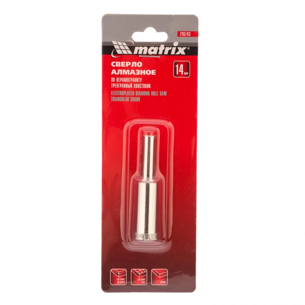 Универсальное алмазное сверло по керамограниту Matrix 726143, 14 х 67 мм, с 3-гранным хвостовиком, применяется для сверления стекла, плитки, кафеля. А за счет высокой концентрации алмазов в режущем слое оно легко справляется с выполнением отверстий в керамограните. Сверло рассчитано на профессиональное использование с дрелями и шуруповертами при рекомендованной скорости 350-700 об/мин. Водяное охлаждение в процессе работы значительно повысит срок его службы.ПреимуществаВысокий ресурс — сверло имеет увеличенный алмазный слой и усиленный корпус.Антикоррозионное покрытие — при мокром сверлении на сверле не образуется ржавчина.Трехгранный хвостовик — сверло не прокручивается в патроне дрели.