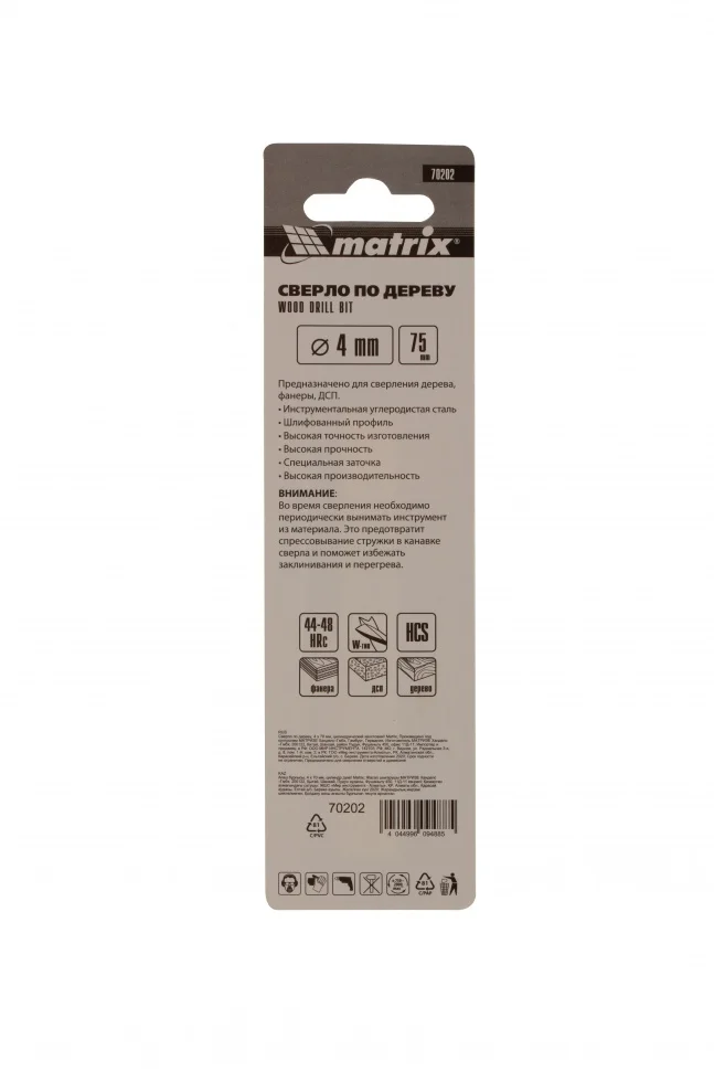Сверло по дереву Matrix 70202, размер 4 х 75 мм, с цилиндрическим хвостовиком, рассчитано на получение небольших по диаметру отверстий в древесине. Пригодится в ходе проведения строительных, ремонтных и отделочных работ. Сверло винтового типа имеет особую конструкцию, благодаря которой обеспечивается эффективный отвод стружки, а отверстие получается качественным и точным.ПреимуществаИнструментальная сталь, из которой выполнено сверло, придает ему долговечность и надежность.Сверло закалено до твердости 44-48 HRC, поэтому отличается прочностью и производительностью.Заточка сверла выполнена на автоматическом оборудовании, что гарантирует качественный результат.Центральный шип предотвращает смещение сверла, поэтому не нужно осуществлять предварительное засверливание.Наружная поверхность сверла отполирована, за счет чего стенки отверстия получаются идеально ровными.
