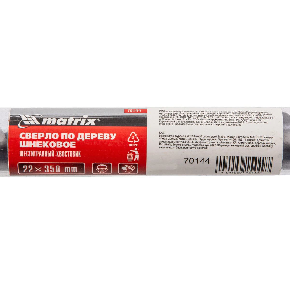 Сверло по дереву шнековое, 22 х 350 мм, шестигранный хвостовик Matrix 70144