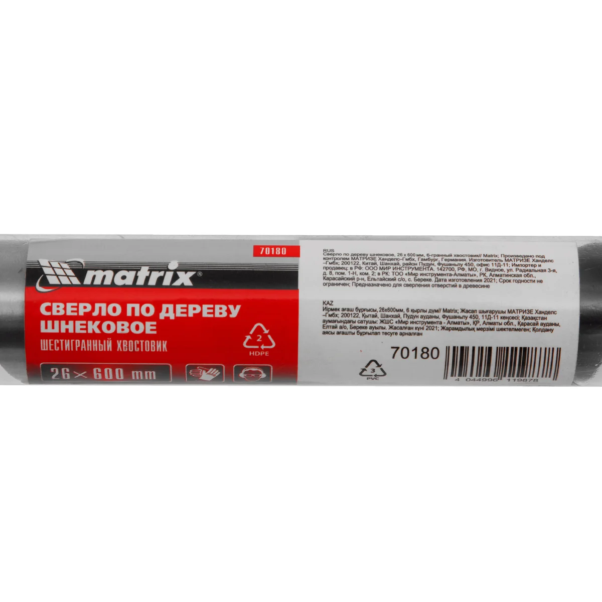 Шнековое сверло по дереву Matrix 70180, размер 26 х 600 мм, с 6-гранным хвостовиком, позволяет осуществлять сверление отверстий на большую глубину. Его можно использовать для работы как с мягкими, так и с твердыми породами древесины. Сверло особой конструкции рассчитано на интенсивное использование с высокими нагрузками в ходе строительных, ремонтных и отделочных работ.ПреимуществаСверло имеет высокий ресурс, т.к. изготовлено из инструментальной стали, а режущая часть закалена до твердости 40 HRC.Снаружи шнек обработан до зеркального блеска, поэтому отверстие получается гладким и ровным.Массивная спираль обеспечивает эффективный отвод стружки, позволяя осуществлять глубокое сверление.За счет центрирующего острия снижается осевая нагрузка, что облегчает засверливание, повышает точность работы и предотвращает смещение сверла.Благодаря шестигранному хвостовику сверло не прокручивается в процессе эксплуатации.