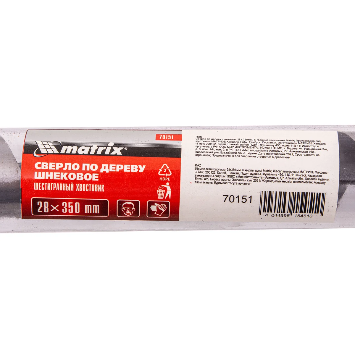 Шнековое сверло по дереву Matrix 70151, размер 28 х 350 мм, с 6-гранным хвостовиком, позволяет осуществлять сверление отверстий на большую глубину. Его можно использовать для работы как с мягкими, так и с твердыми породами древесины. Сверло особой конструкции рассчитано на интенсивное использование с высокими нагрузками в ходе строительных, ремонтных и отделочных работ.ПреимуществаСверло имеет высокий ресурс, т.к. изготовлено из инструментальной стали, а режущая часть закалена до твердости 40 HRC.Снаружи шнек обработан до зеркального блеска, поэтому отверстие получается гладким и ровным.Массивная спираль обеспечивает эффективный отвод стружки, позволяя осуществлять глубокое сверление.За счет центрирующего острия снижается осевая нагрузка, что облегчает засверливание, повышает точность работы и предотвращает смещение сверла.Благодаря шестигранному хвостовику сверло не прокручивается в процессе эксплуатации.