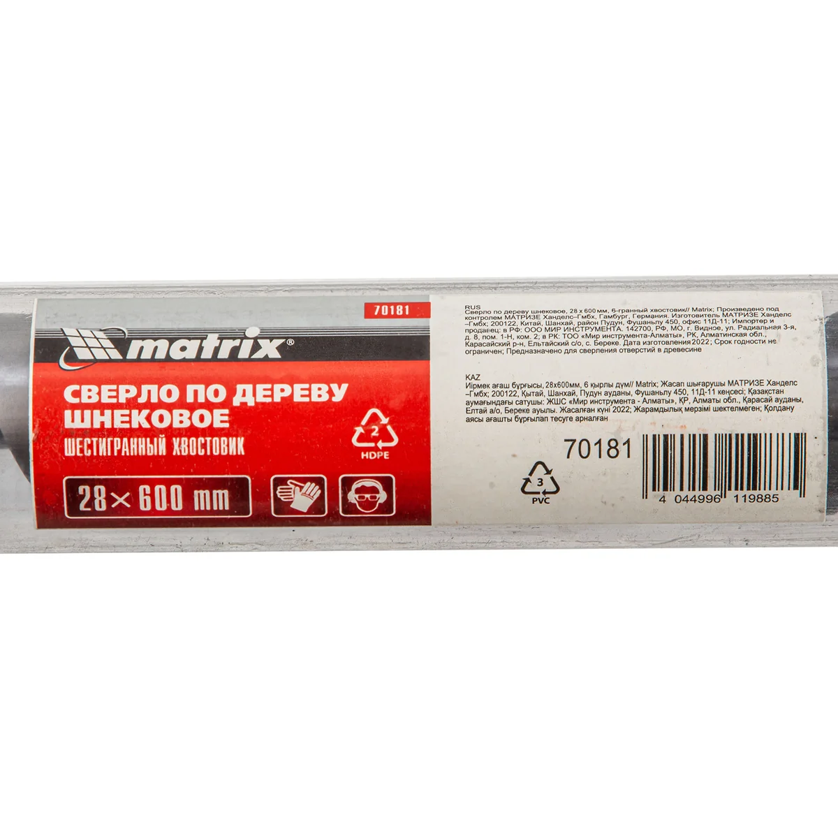 Шнековое сверло по дереву Matrix 70181, размер 28 х 600 мм, с 6-гранным хвостовиком, позволяет осуществлять сверление отверстий на большую глубину. Его можно использовать для работы как с мягкими, так и с твердыми породами древесины. Сверло особой конструкции рассчитано на интенсивное использование с высокими нагрузками в ходе строительных, ремонтных и отделочных работ.ПреимуществаСверло имеет высокий ресурс, т.к. изготовлено из инструментальной стали, а режущая часть закалена до твердости 40 HRC.Снаружи шнек обработан до зеркального блеска, поэтому отверстие получается гладким и ровным.Массивная спираль обеспечивает эффективный отвод стружки, позволяя осуществлять глубокое сверление.За счет центрирующего острия снижается осевая нагрузка, что облегчает засверливание, повышает точность работы и предотвращает смещение сверла.Благодаря шестигранному хвостовику сверло не прокручивается в процессе эксплуатации.