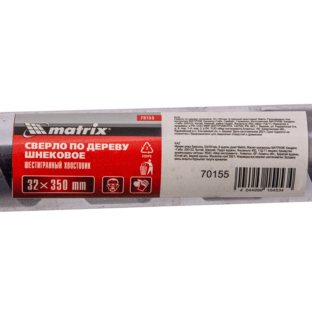 Шнековое сверло по дереву Matrix 70155, размер 32 х 350 мм, с 6-гранным хвостовиком, позволяет осуществлять сверление отверстий на большую глубину. Его можно использовать для работы как с мягкими, так и с твердыми породами древесины. Сверло особой конструкции рассчитано на интенсивное использование с высокими нагрузками в ходе строительных, ремонтных и отделочных работ.ПреимуществаСверло имеет высокий ресурс, т.к. изготовлено из инструментальной стали, а режущая часть закалена до твердости 40 HRC.Снаружи шнек обработан до зеркального блеска, поэтому отверстие получается гладким и ровным.Массивная спираль обеспечивает эффективный отвод стружки, позволяя осуществлять глубокое сверление.За счет центрирующего острия снижается осевая нагрузка, что облегчает засверливание, повышает точность работы и предотвращает смещение сверла.Благодаря шестигранному хвостовику сверло не прокручивается в процессе эксплуатации.
