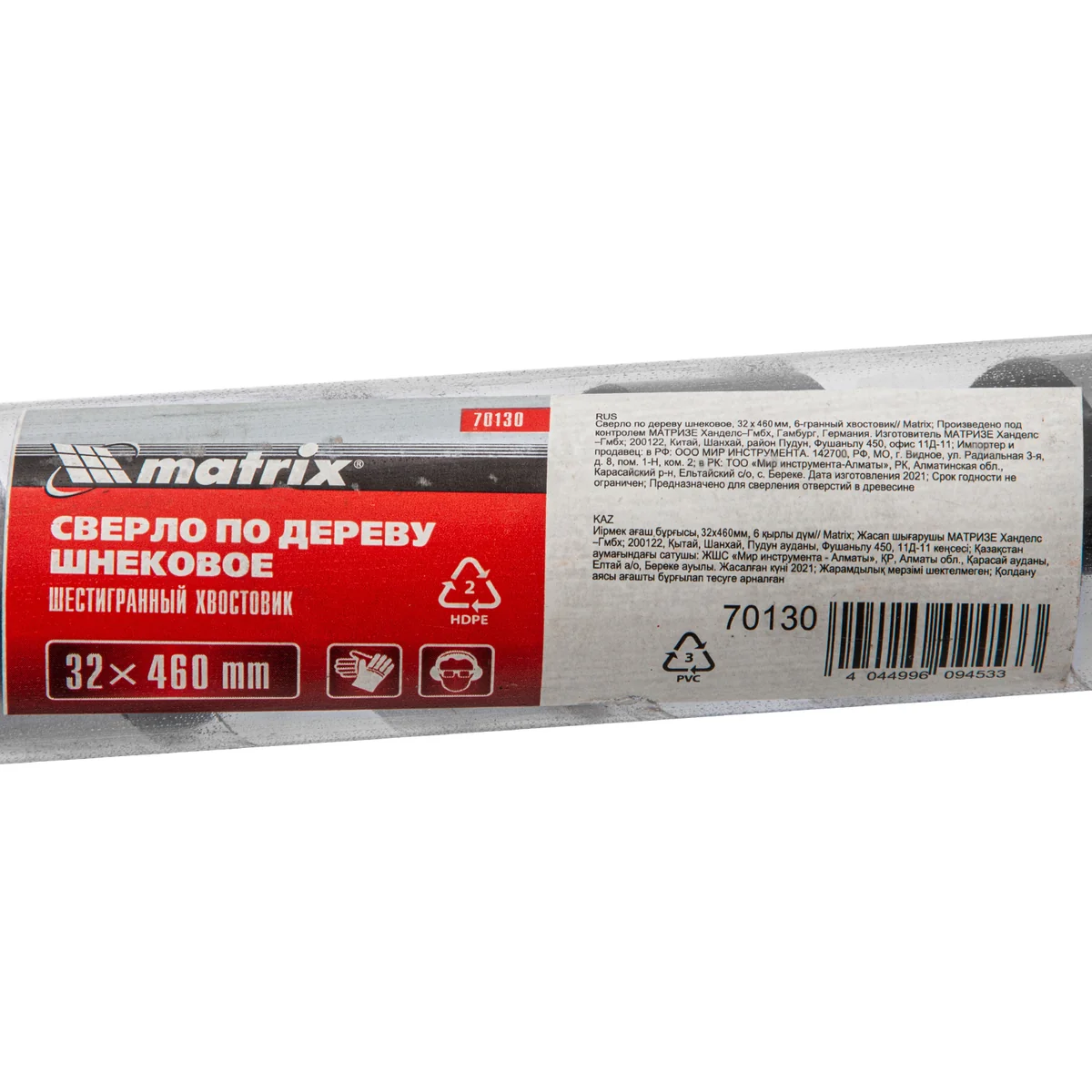 Шнековое сверло по дереву Matrix 70130, размер 32 х 460 мм, с 6-гранным хвостовиком, позволяет осуществлять сверление отверстий на большую глубину. Его можно использовать для работы как с мягкими, так и с твердыми породами древесины. Сверло особой конструкции рассчитано на интенсивное использование с высокими нагрузками в ходе строительных, ремонтных и отделочных работ.ПреимуществаСверло имеет высокий ресурс, т.к. изготовлено из инструментальной стали, а режущая часть закалена до твердости 40 HRC.Снаружи шнек обработан до зеркального блеска, поэтому отверстие получается гладким и ровным.Массивная спираль обеспечивает эффективный отвод стружки, позволяя осуществлять глубокое сверление.За счет центрирующего острия снижается осевая нагрузка, что облегчает засверливание, повышает точность работы и предотвращает смещение сверла.Благодаря шестигранному хвостовику сверло не прокручивается в процессе эксплуатации.