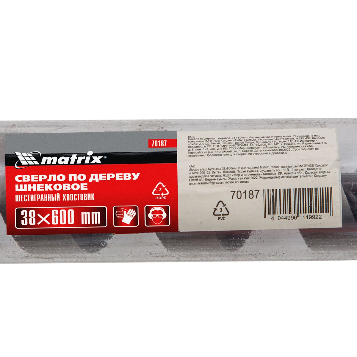 Сверло по дереву шнековое, 38 х 600 мм, шестигранный хвостовик Matrix 70187