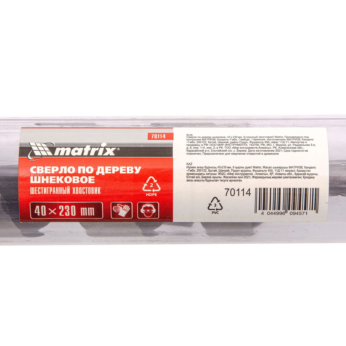 Сверло по дереву шнековое, 40 х 230 мм, шестигранный хвостовик Matrix 70114