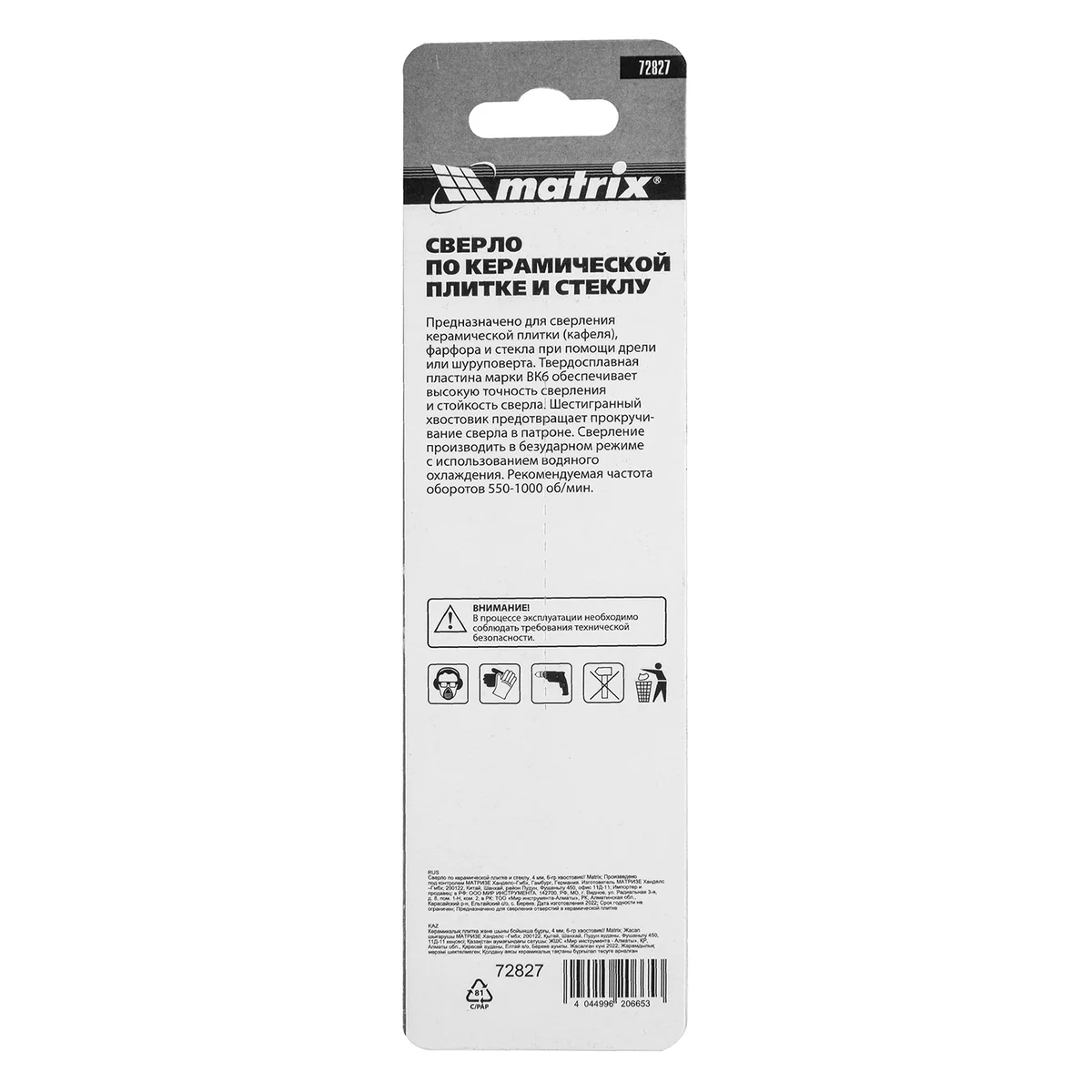 Сверло Matrix 72827, 4 мм, шестигранным хвостовиком, рассчитано на сверление керамической плитки, стекла, мрамора и фарфора. Сверло подходит для интенсивного использования. В процессе работы рекомендуется применять водяное охлаждение для увеличения ресурса сверла. Преимущества Универссальность - предназначено для сверления керамической (кафельной) плитки, стекла, мрамора, фарфора.Высокий ресурс - режущая пластина изготовлена из износостойкого сплава YG6X.Точное сверление - cпециальный профиль режущей пластины обеспечивает легкое засверливание и точное сверление ответстий.Комфортная работа - сверло имеет 6-гранный хвостовик с прорезью (Е6,, который не прокручивается в патроне, а установка сверла в быстрозажимной патрон занимает всего несколько секунд.