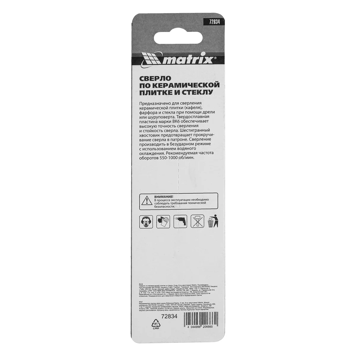 Сверло Matrix 72834, 5 мм, шестигранным хвостовиком, рассчитано на сверление керамической плитки, стекла, мрамора и фарфора. Сверло подходит для интенсивного использования. В процессе работы рекомендуется применять водяное охлаждение для увеличения ресурса сверла.Преимущества Универссальность - предназначено для сверления керамической (кафельной) плитки, стекла, мрамора, фарфора.Высокий ресурс - режущая пластина изготовлена из износостойкого сплава YG6X.Точное сверление - cпециальный профиль режущей пластины обеспечивает легкое засверливание и точное сверление ответстий.Комфортная работа - сверло имеет 6-гранный хвостовик с прорезью (Е6,, который не прокручивается в патроне, а установка сверла в быстрозажимной патрон занимает всего несколько секунд.