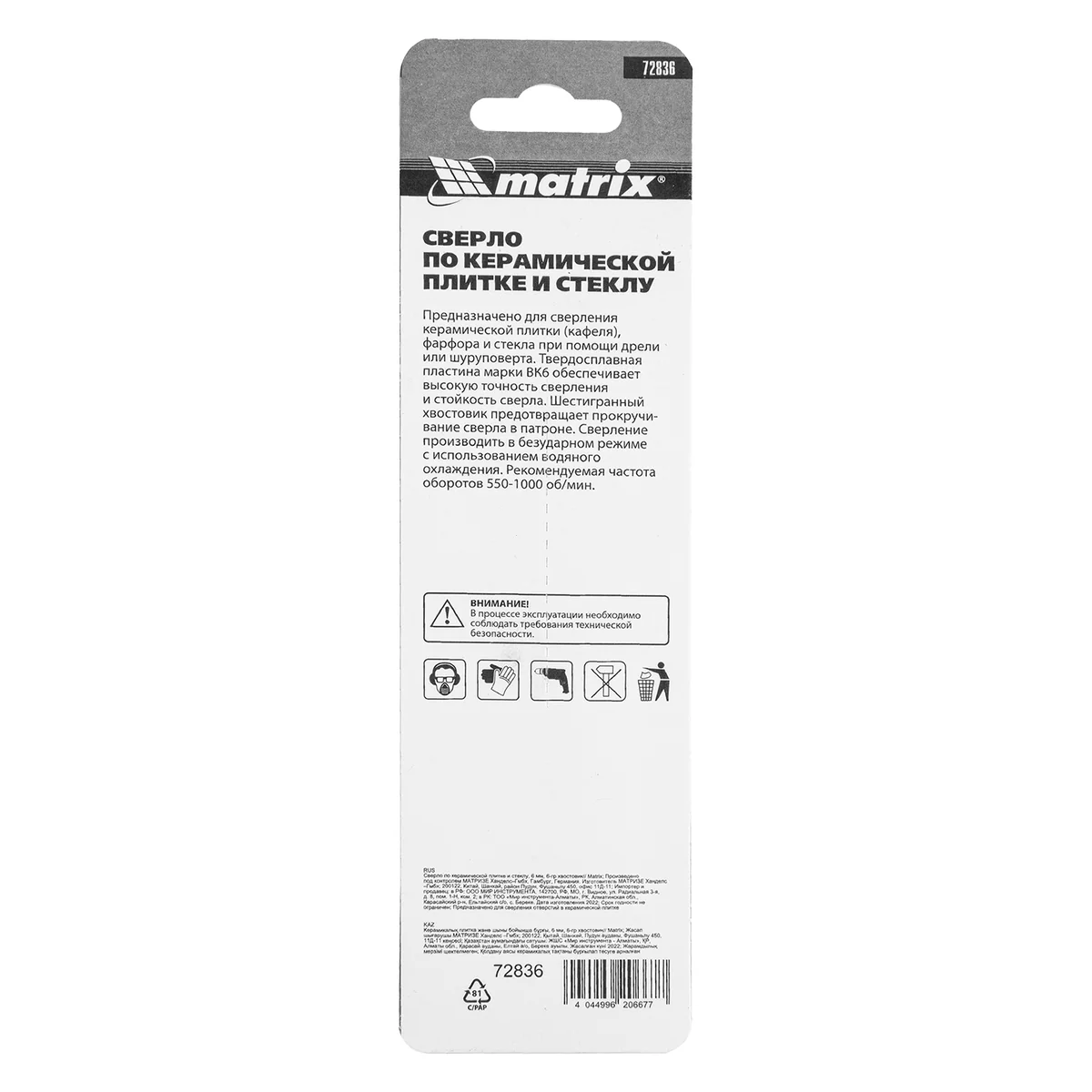 Сверло Matrix 72836, 6 мм, шестигранным хвостовиком, рассчитано на сверление керамической плитки, стекла, мрамора и фарфора. Сверло подходит для интенсивного использования. В процессе работы рекомендуется применять водяное охлаждение для увеличения ресурса сверла. Преимущества Универссальность - предназначено для сверления керамической (кафельной) плитки, стекла, мрамора, фарфора.Высокий ресурс - режущая пластина изготовлена из износостойкого сплава YG6X. Точное сверление - cпециальный профиль режущей пластины обеспечивает легкое засверливание и точное сверление ответстий.Комфортная работа - сверло имеет 6-гранный хвостовик с прорезью (Е6,, который не прокручивается в патроне, а установка сверла в быстрозажимной патрон занимает всего несколько секунд.
