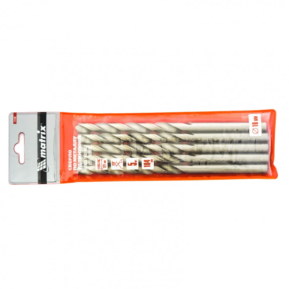 Сверло по металлу, 10 х 184 мм, полированное, удл, HSS, 5 шт, цилиндрический хвостовик Matrix 715100
