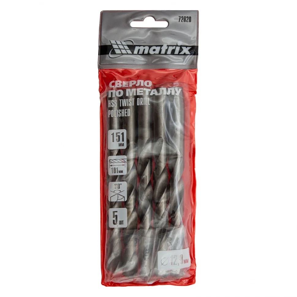 Сверло по металлу, 12 мм, полированное, HSS, 5 шт, цилиндрический хвостовик Matrix 72020