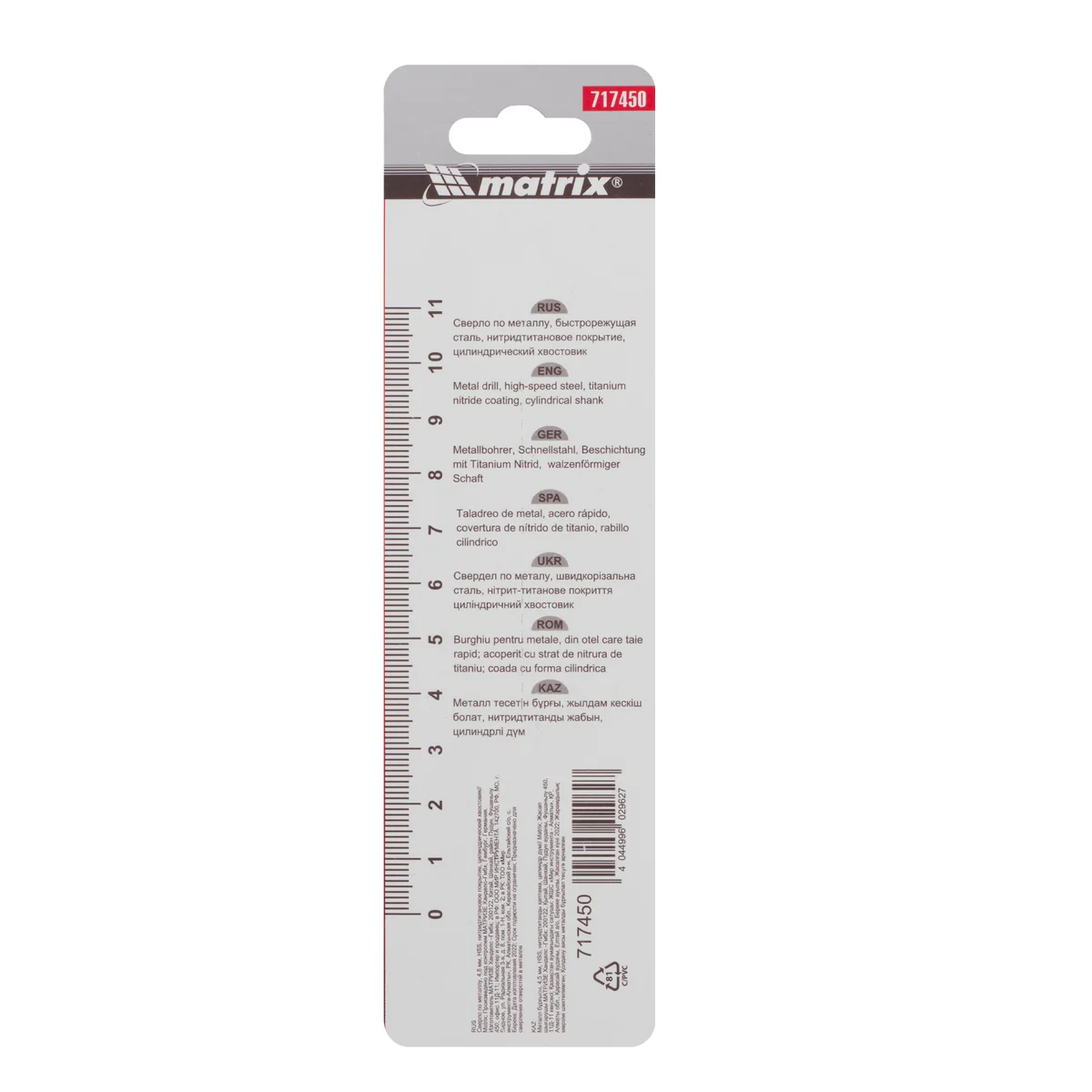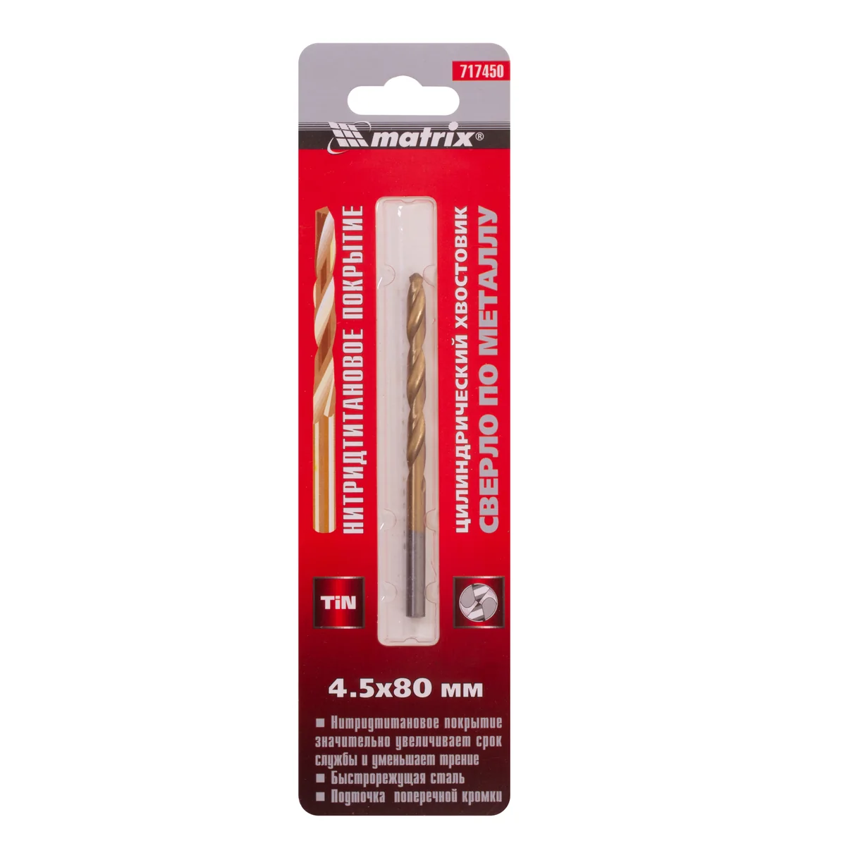 Сверло по металлу, 4.5 мм, HSS, нитридтитановое покрытие, цилиндрический хвостовик Matrix 717450