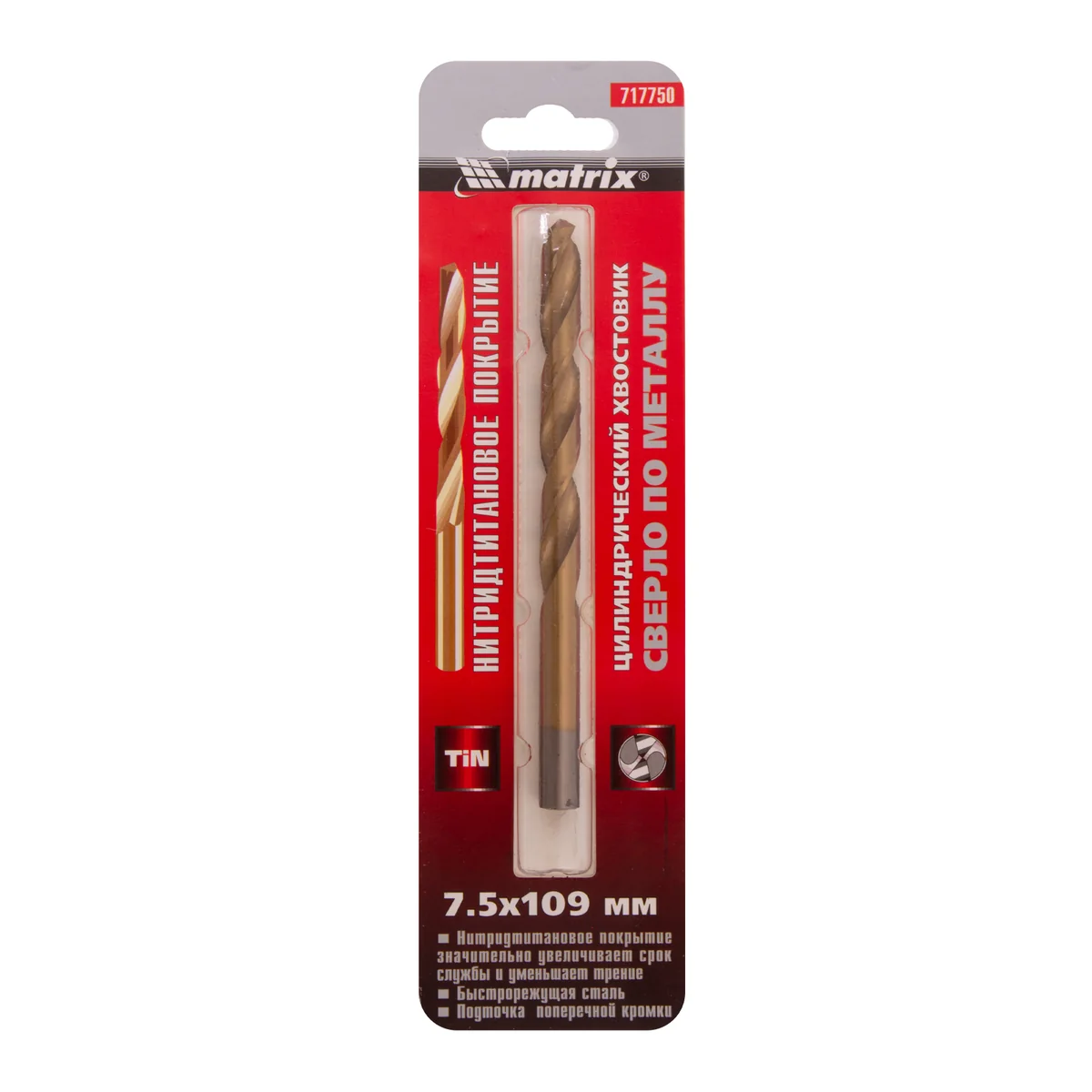 Сверло по металлу, 7.5 мм, HSS, нитридтитановое покрытие, цилиндрический хвостовик Matrix 717750