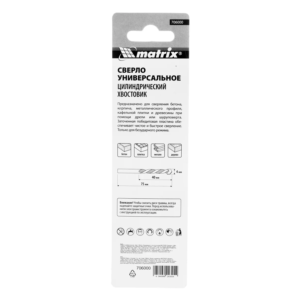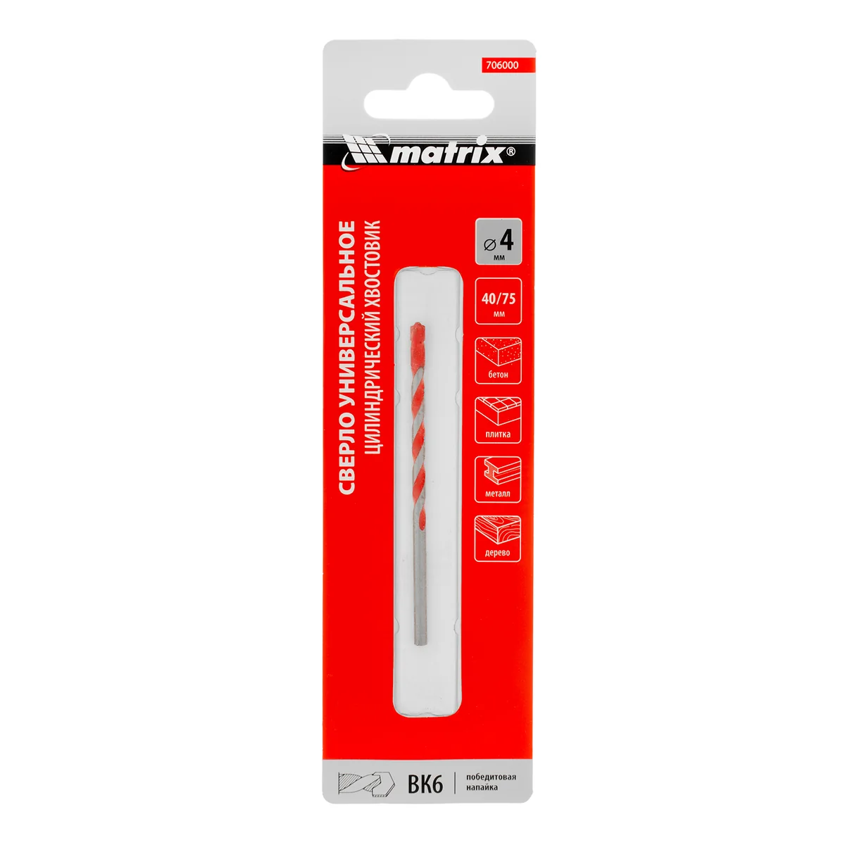 Универсальное сверло Matrix 706000 длиной 75 мм позволяет получать отверстия диаметром 4 мм в древесине, керамической плитке, а также в стали и бетоне с помощью дрели или шуруповерта. Твердосплавная режущая пластина обеспечивает эффективную работу с любыми материалами. Сверло пригодится в мастерской, гараже, а также дома и на даче.