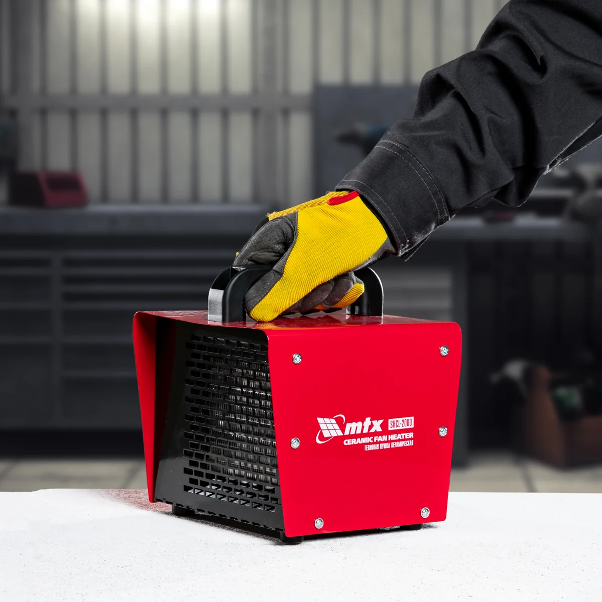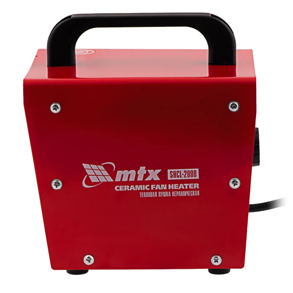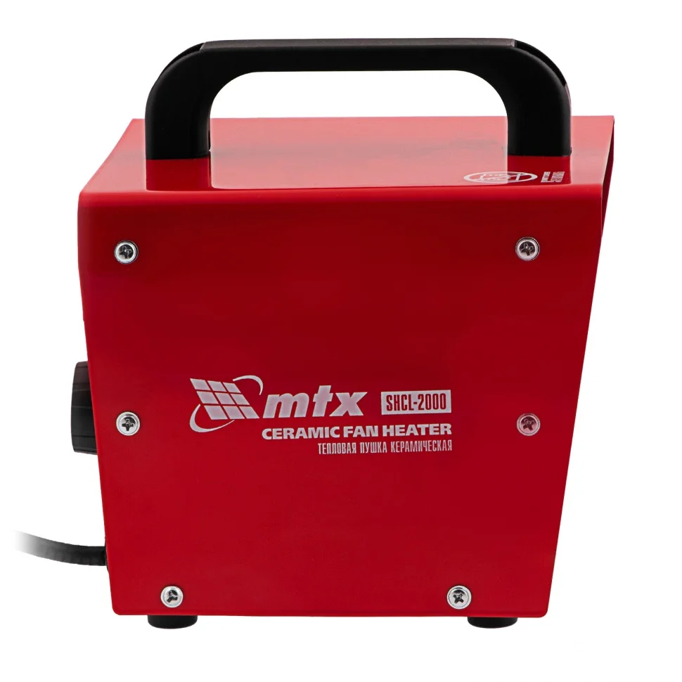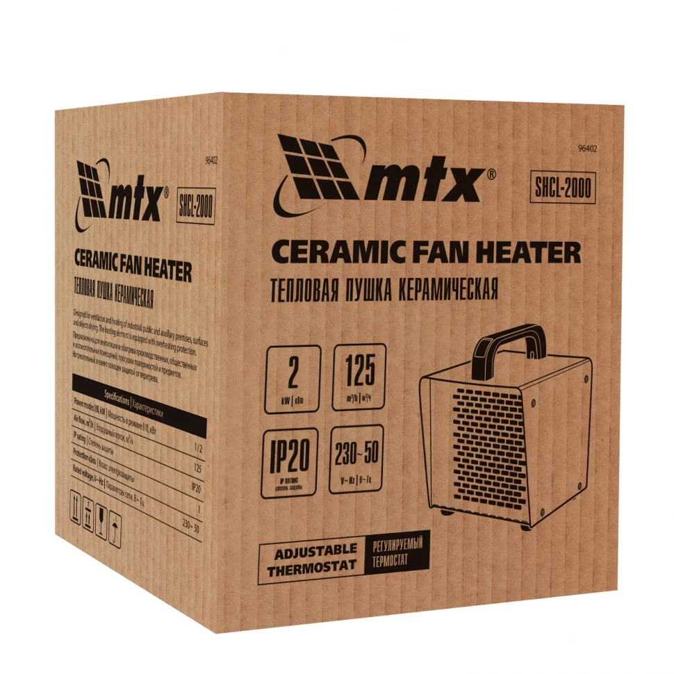 Керамическая тепловая пушка MTX SHCL-2000 96402 производительностью 125 куб. м/ч, в квадратном корпусе, работает в режиме нагрева на полной мощности 2 кВт или частичной 1 кВт, а также в режиме вентиляции. Предназначена для обогрева цехов, складов, мастерских и других нежилых помещений площадью до 20 кв. м. Также позволяет быстро просушивать различные поверхности, например, стяжки пола или оштукатуренные стены.Отличительная черта пушки — технология PTC. Металлокерамические нагревательные элементы обладают функцией саморегуляции электрического сопротивления, что обеспечивает оптимальную температуру нагревательного элемента и пожаро-, взрывобезопасность изделия. При сохранении физической целостности нагревательный элемент не теряет своих свойств на протяжении всего срока службы.ПреимуществаВстроенный термостат — заданная температура поддерживается автоматически, без участия пользователя.3 режима работы — вентиляция, обогрев на мощности 1 кВт и обогрев на полной мощности 2 кВт.Экологичность — керамический нагреватель не сушит воздух и не выделяет вредных веществ, поэтому пушка безопасна для людей и животных.Надежность — кожух из листовой стали защищает внутренние элементы от повреждений.Простое управление — на задней панели расположен переключатель режимов и регулятор температуры.Функциональность — можно выбрать мощность нагрева в соответствии с поставленными задачами.Система защиты — в случае перегрева корпуса нагреватель отключается для предотвращения поломки оборудования.Устойчивость — благодаря 4 опорам пушка не опрокидывается во время работы.Удобная транспортировка — пушка весит 1,6 кг, а в верхней части корпуса имеется специальная ручка.