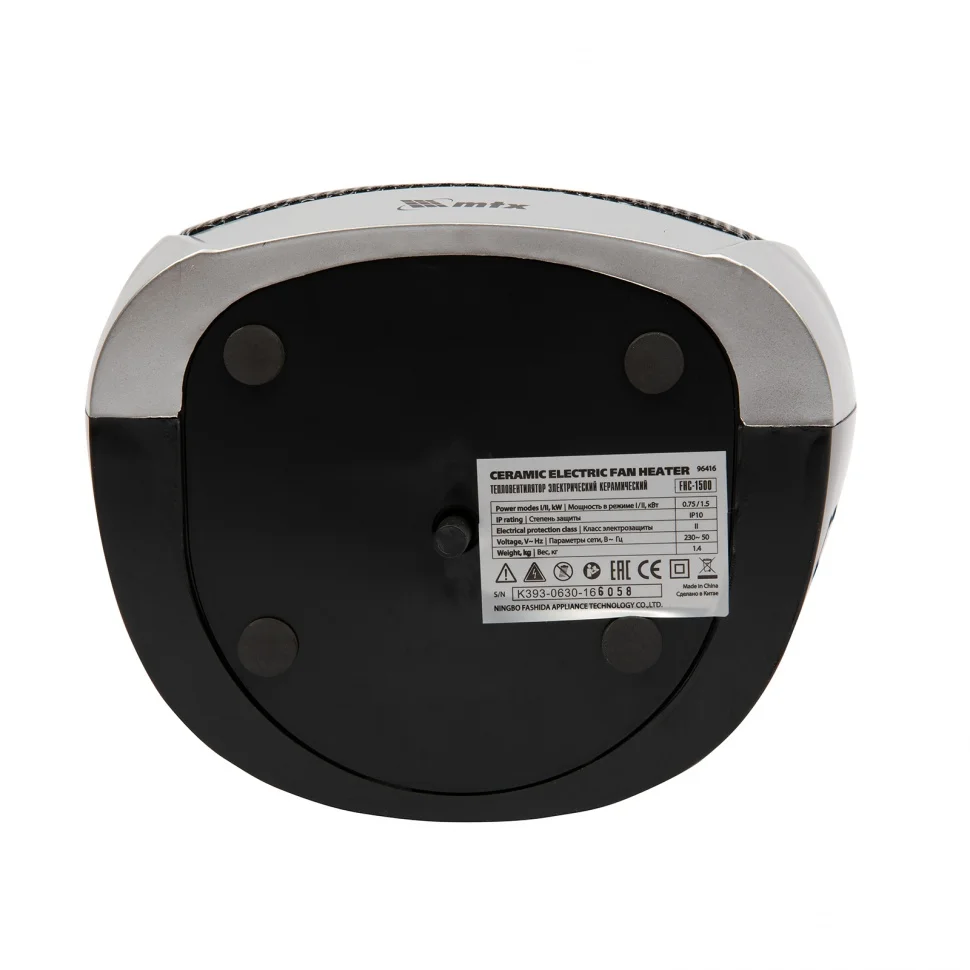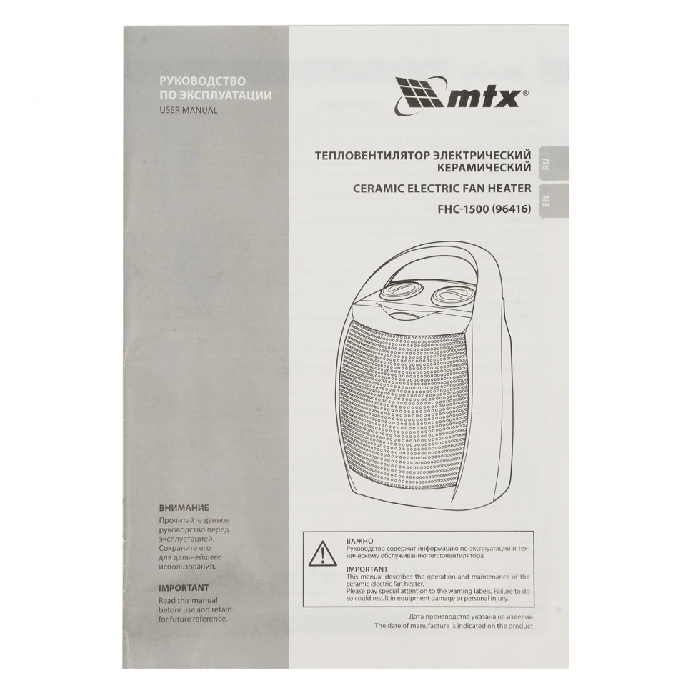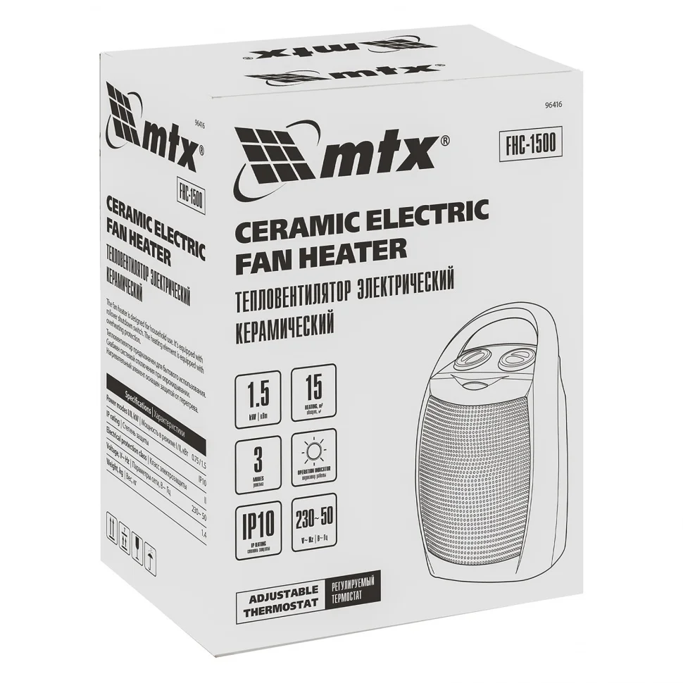 Тепловентилятор MTX FHC-1500 96416 работает в одном из трех режимов работы: вентиляция без нагрева, нагрев на мощности 750 Вт и 1500 Вт. Используется для обогрева комнат площадью до 20 кв. м на даче или в квартире. Тепловентилятор поддерживает необходимую температуру в холодную погоду и обеспечивает вентиляцию помещения в жару. Благодаря керамическому нагревательному элементу устройство не сжигает пыль, не выделяет вредных веществ и не сушит воздух, а также отличается повышенной пожаробезопасностью.ПреимуществаСоздание оптимального микроклимата — устройство имеет три режима работы: вентиляция (без нагрева), теплый воздух (на мощности 750 Вт), горячий воздух (1500 Вт).Простое управление — регулировка рабочих режимов осуществляется с помощью поворотных переключателей.Встроенный термостат — тепловентилятор автоматически поддерживает установленную температуру, участие пользователя не требуется.Безопасность — биметаллический многоразовый предохранитель отключает питание при риске перегрева.Датчик опрокидывания — при падении тепловентилятор моментально отключается.Удобная эксплуатация — при включении загорается световой индикатор, сигнализирующий о начале работы.Комфортная транспортировка — тепловентилятор весит 1,6 кг и снабжен удобной ручкой.Высокое качество — устройство безопасно для здоровья человека и для окружающей среды, что подтверждает сертификат СЕ.