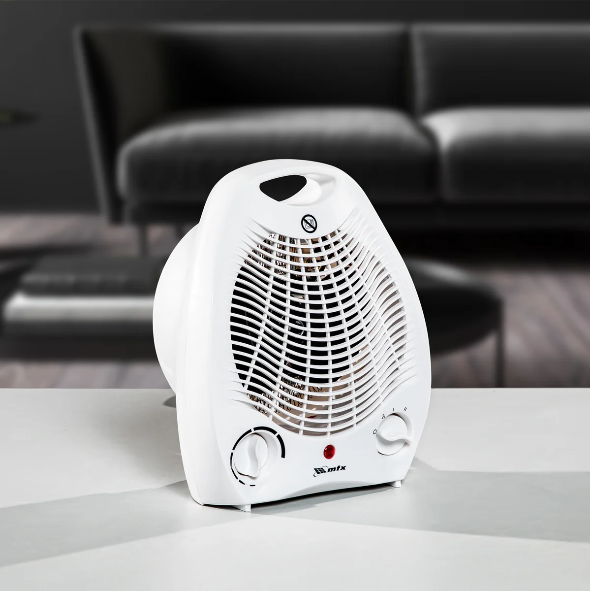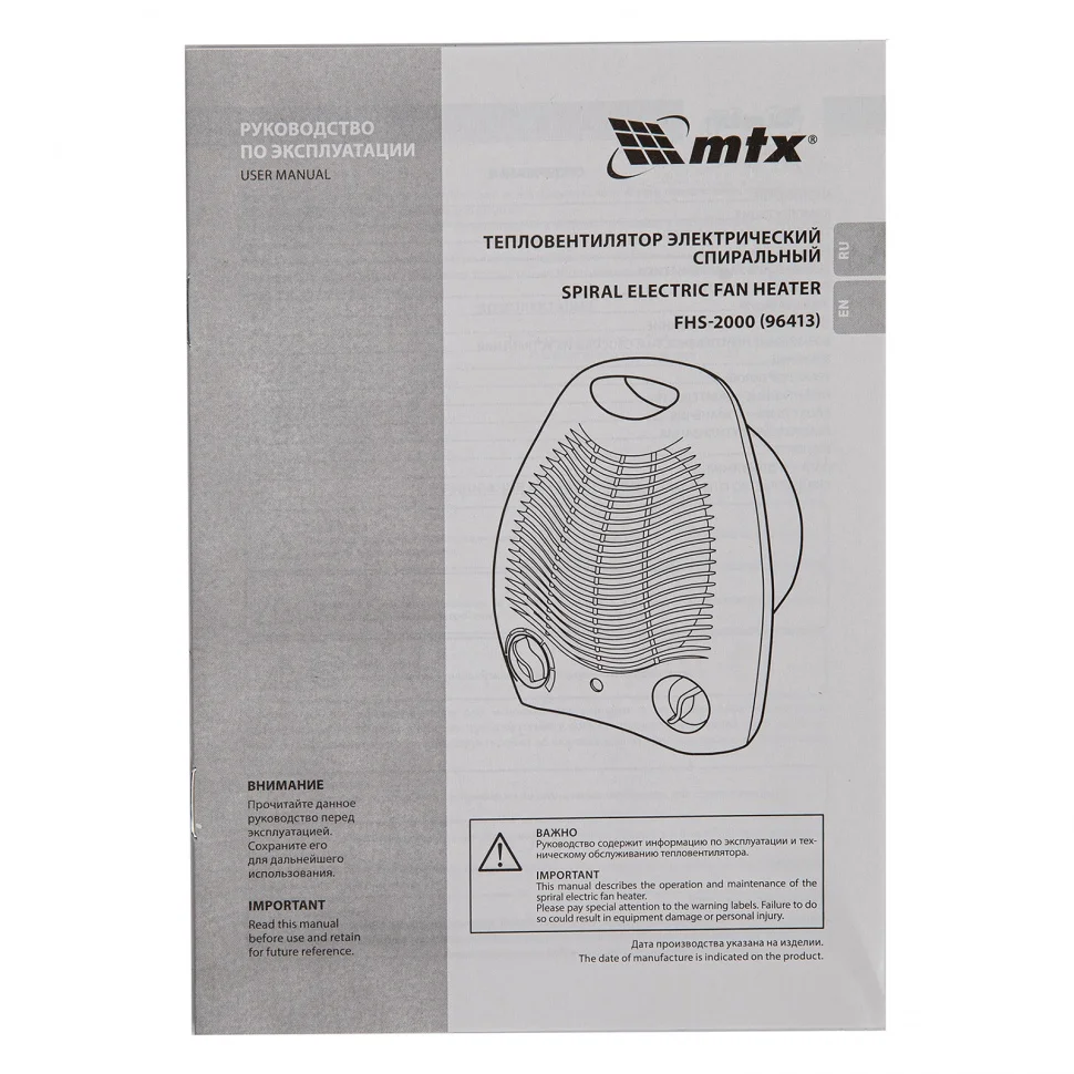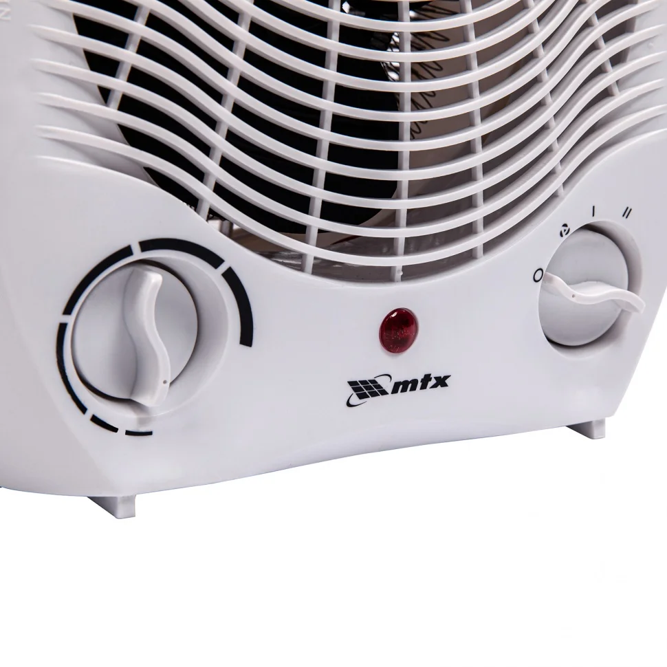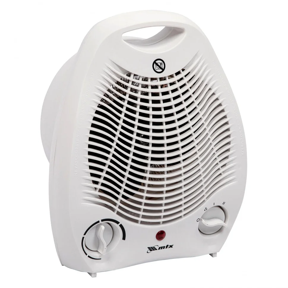 Электрический тепловентилятор MTX FHS-2000 96413 мощностью 1000/2000 Вт, с нагревателем спирального типа и вентилятором, имеет 3 режима работы и используется для обогрева комнат площадью до 20 кв. м в квартире или на даче. Его можно применять для поддержания необходимой температуры в помещении в холодную погоду, а также для вентиляции в жару. Устройство устанавливают на полу или на столе, управление осуществляется при помощи 2 механических переключателей.ПреимуществаУдобная регулировка — можно установить один из трех режимов работы: вентиляция (без нагрева), теплый воздух (потребляемая мощность 1 кВт), горячий воздух (2 кВт).Встроенный термостат — заданная температура поддерживается автоматически, без участия пользователя.Двухуровневая защита — биметаллический элемент не допускает поломки нагревательной части, отключая тепловентилятор при перегреве, а контрольный тепловой резистор обеспечивает аварийную противопожарную защиту.Электрическая спираль — тепловентилятор быстро нагревает воздух и отличается более низкой стоимостью по сравнению с аналогами, имеющими керамический нагревательный элемент.Простое использование — при включении устройства загорается световой индикатор, оповещающий о начале работы.Удобное перемещение — тепловентилятор отличается компактностью, весит всего 1,05 кг и имеет транспортировочную ручку на корпусе.Сертификат СЕ — устройство безопасно для здоровья человека и для окружающей среды.