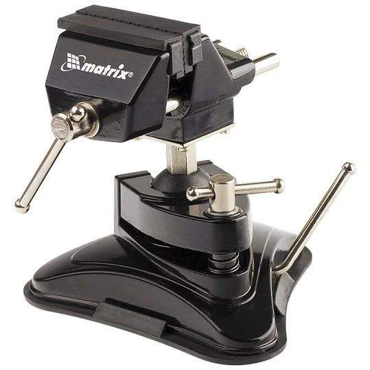 Настольные тиски Matrix 18506 с резиновой вакуумной присоской и шарнирным механизмом, шириной рабочих губок 70 мм, используются для фиксации обрабатываемых деталей. Расстояние между губками регулируется до 50 мм, что позволяет закреплять небольшие заготовки при осуществлении ювелирных, ремонтных и других тонких работ.ПреимуществаРезиновая вакуумная присоска позволяет устанавливать тиски на ровных поверхностях любого типа, поэтому их удобно брать даже на выездные работы.За счет шарнирного механизма верхнюю часть тисков можно поворачивать и наклонять с амплитудой 360 градусов для изменения положения заготовки и ее обработки под разными углами.Прижимные губки дополнены резиновыми накладками, которые позволяют фиксировать хрупкие детали без риска поломки.