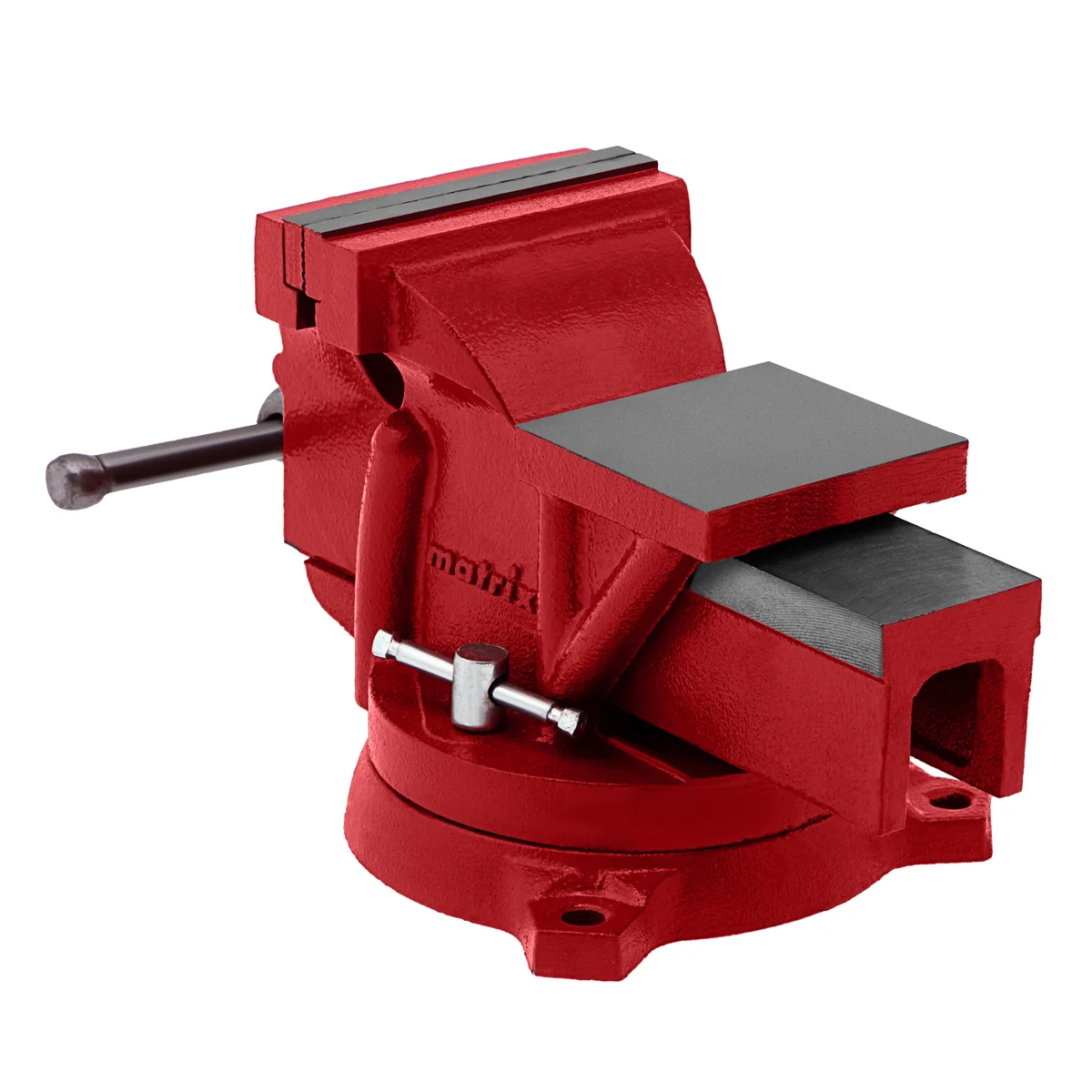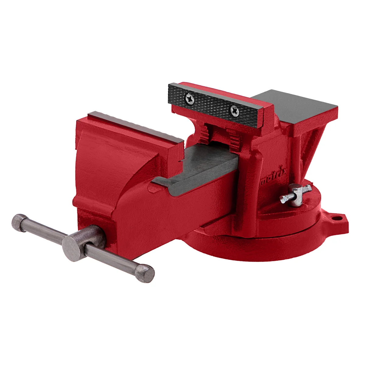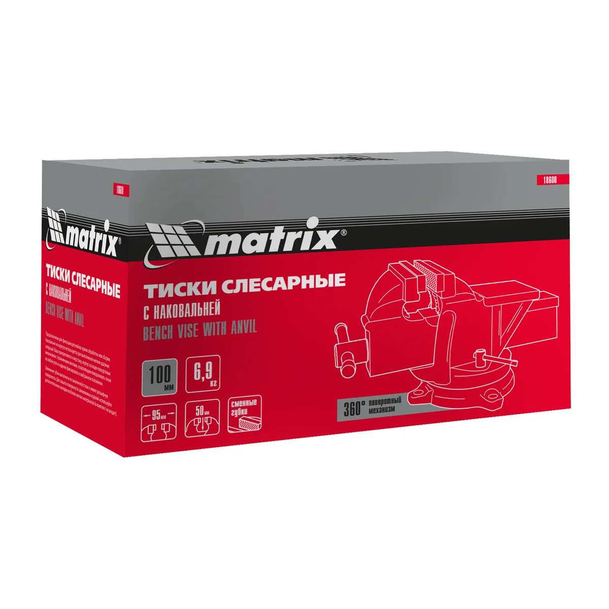 Поворотные слесарные тиски Matrix 18600 с наковальней и губками шириной 100 мм имеют рабочий ход 95 мм и предназначены для захвата и фиксации различных деталей. Поворотный механизм с прижимными винтами позволяет вращать тиски на 360° и фиксировать их в выбранном положении для удобной обработки заготовок с разных сторон. Инструмент используется для шлифовки, сверления и проведения других работ. Будет полезен в мастерской и гараже.ПреимуществаПрочность — корпус выполнен из чугуна, прижимные губки — из стали 45 твердостью 45-53 HRC.Коррозионная стойкость — тиски покрыты защитной порошковой эмалью.Надежная фиксация — губки с рельефной поверхностью не скользят по поверхности заготовки.Дополнительные возможности — на корпусе имеется наковальня для выполнения небольших ударных работ.Защита поверхности заготовок — на губки можно установить накладки из более мягкого материала (не входят в комплект поставки).Простой монтаж — в основании имеются отверстия для крепления к верстаку.