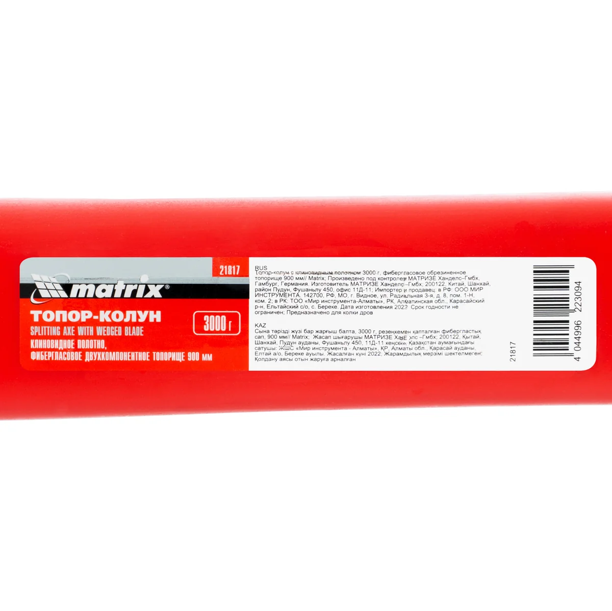 Топор-колун Matrix 21817 длиной 900 мм, с клиновидным полотном весом 3000 г и фибергласовым обрезиненным топорищем, предназначен для колки и рубки древесины. Длинное топорище в сочетании с массивной рабочей частью позволяет наносить сильные удары и справляться с поленьями большого диаметра. Инструмент пригодится для заготовки дров.ПреимуществаПрочность и высокий ресурс — полотно выковано из стали 45 и закалено до твердости 48-50 HRC, режущая кромка долго остается острой.Высокая производительность — рабочая часть утолщена по бокам, что повышает эффективность наносимых ударов.Фибергласовое топорище — рукоять топора выдерживает динамические нагрузки, не разрушается под воздействием внешней среды, а также гасит вибрации, уменьшая отдачу от удара.Комфортная работа — топорище с резиновой накладкой не выскальзывает из рук.