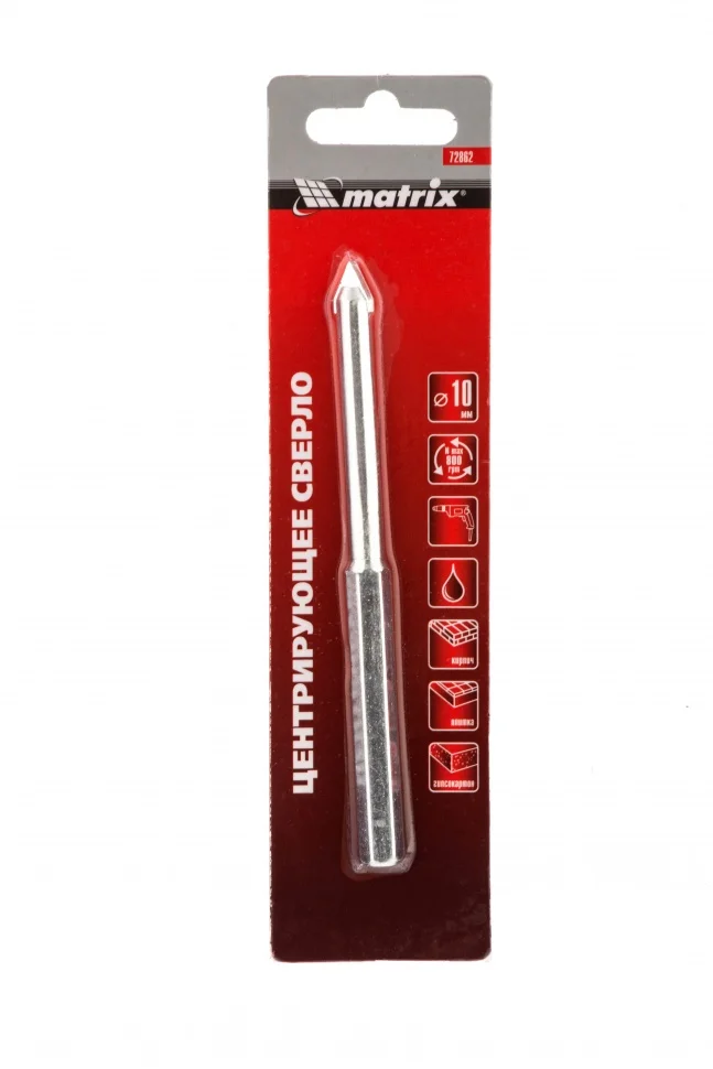 Центрирующее сверло для коронок Matrix 72862, 10 мм, с карбидным напылением и 6-гранным хвостовиком, устанавливается в державку Matrix 72860. Сверло облегчает процесс засверливания и повышает точность работы, предотвращая смещение державки и коронки. Также с его помощью державка с коронкой фиксируются в патроне дрели и шуруповерта. Сверло рассчитано на работу с водяным охлаждением, что значительно повышает его срок службы.ПреимуществаТвердосплавная пластина выполнена из стали ВК6, которая гарантирует ее износостойкость и долговечность.6-гранный хвостовик сверла предотвращает его прокручивание в патроне.Карбидное напыление обеспечивает высокую износостойкость.Сверло предназначено для установки в державку Matrix 72860.