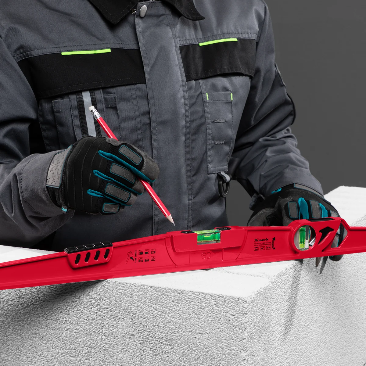Литой алюминиевый уровень Matrix 34907 длиной 600 мм, с ударной площадкой, оснащен 2 глазками, 1 из которых фронтальный. Инструмент предназначен для использования на стройплощадке, при выполнении ремонтных и монтажных работ. Оптимально подходит для использования при выравнивании плитки и кирпичной кладки.Преимущества Цельнометаллический алюминиевый профиль обладает стойкостью к механическим нагрузкам, поэтому прослужит долго. Ударная площадка позволяет слегка подбивать инструмент резиновой киянкой для дополнительного выравнивания материала. Вертикальный глазок с зеркальным отражателем повышает точность и скорость работы, исключая ошибки бокового зрения. Каждый глазок имеет 4 дополнительные насечки, это позволяет повысить точность проводимых измерений. Схематичные пиктограммы и двухсторонний вкладыш на корпусе позволяют пользователю легко и быстро подобрать нужный уровень.