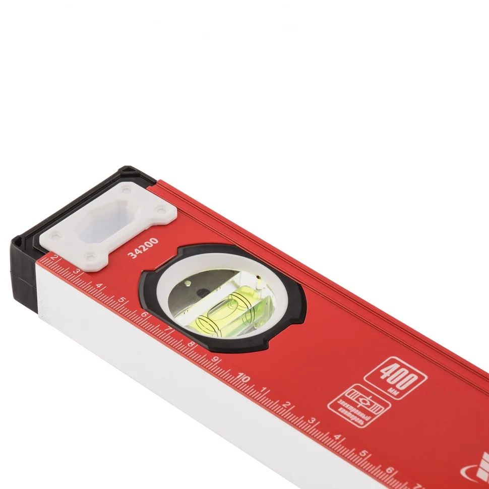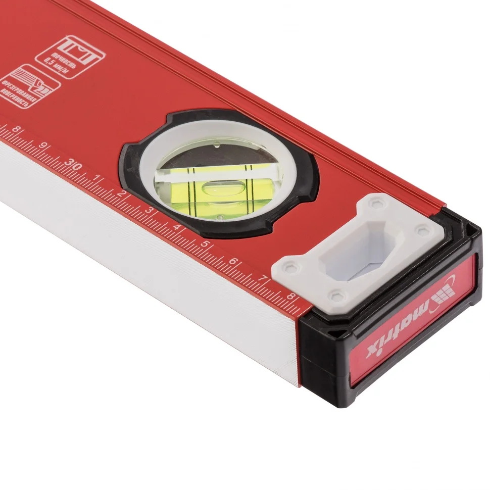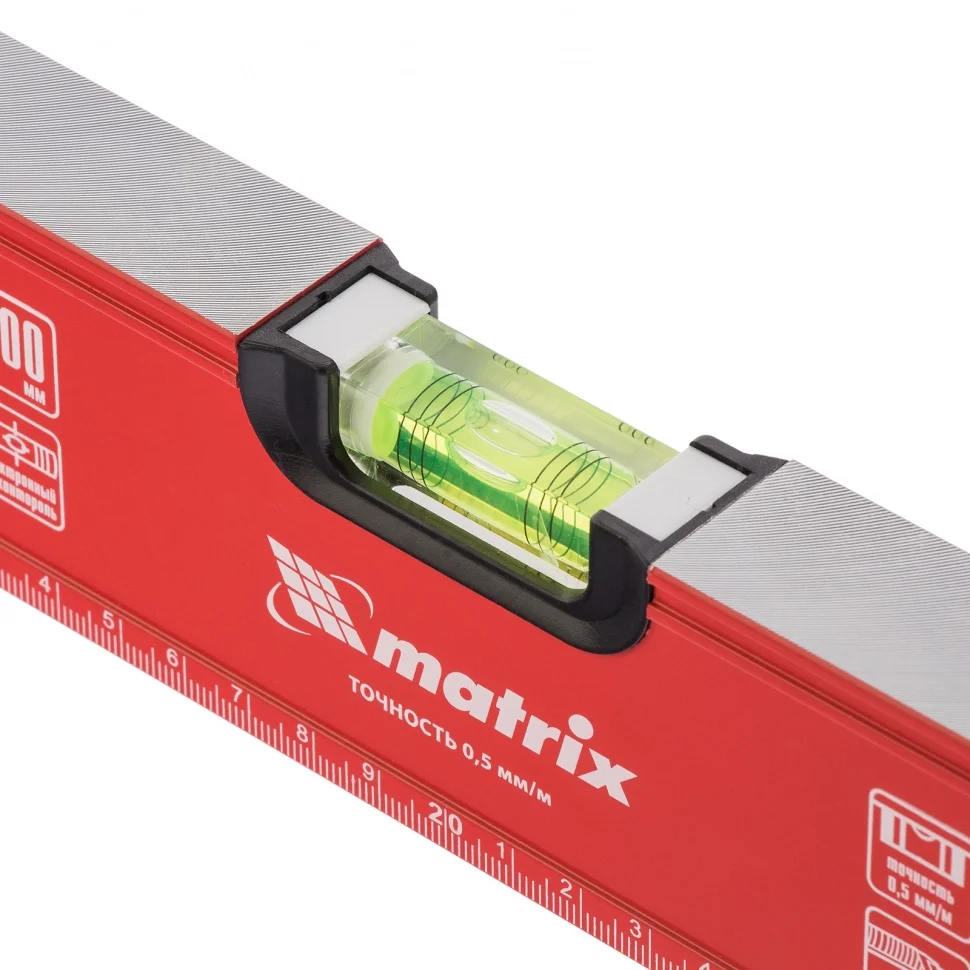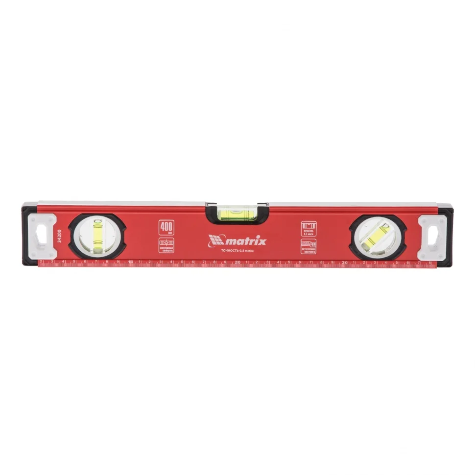 Алюминиевый фрезерованный уровень Matrix 34200 длиной 400 мм, с 3 глазками, рассчитан на определение отклонений от горизонтальной и вертикальной поверхностей и угла 45 градусов. Строительный уровень станет незаменимым помощником для мастеров, т.к. обеспечивает высокую точность работы, а следовательно, и качественный результат.Для определения отклонения вертикали 90 градусов необходимо использовать пузырьковую ампулу только в верхнем положении уровня. Только базовая поверхность является рабочей (противоположная ампуле 180 градусов).ПреимуществаАлюминиевый профиль обладает высокой прочностью и жесткостью, что повышает ресурс уровня.Электронная калибровка глазков позволяет добиться высокой точности измерений.Фрезерованная рабочая часть снижает погрешность измерений до минимальных 0,5 мм/м.Магниты служат для фиксации инструмента на металлических поверхностях.Измерительная шкала на корпусе поможет определить размер предметов, заготовок и т.д.