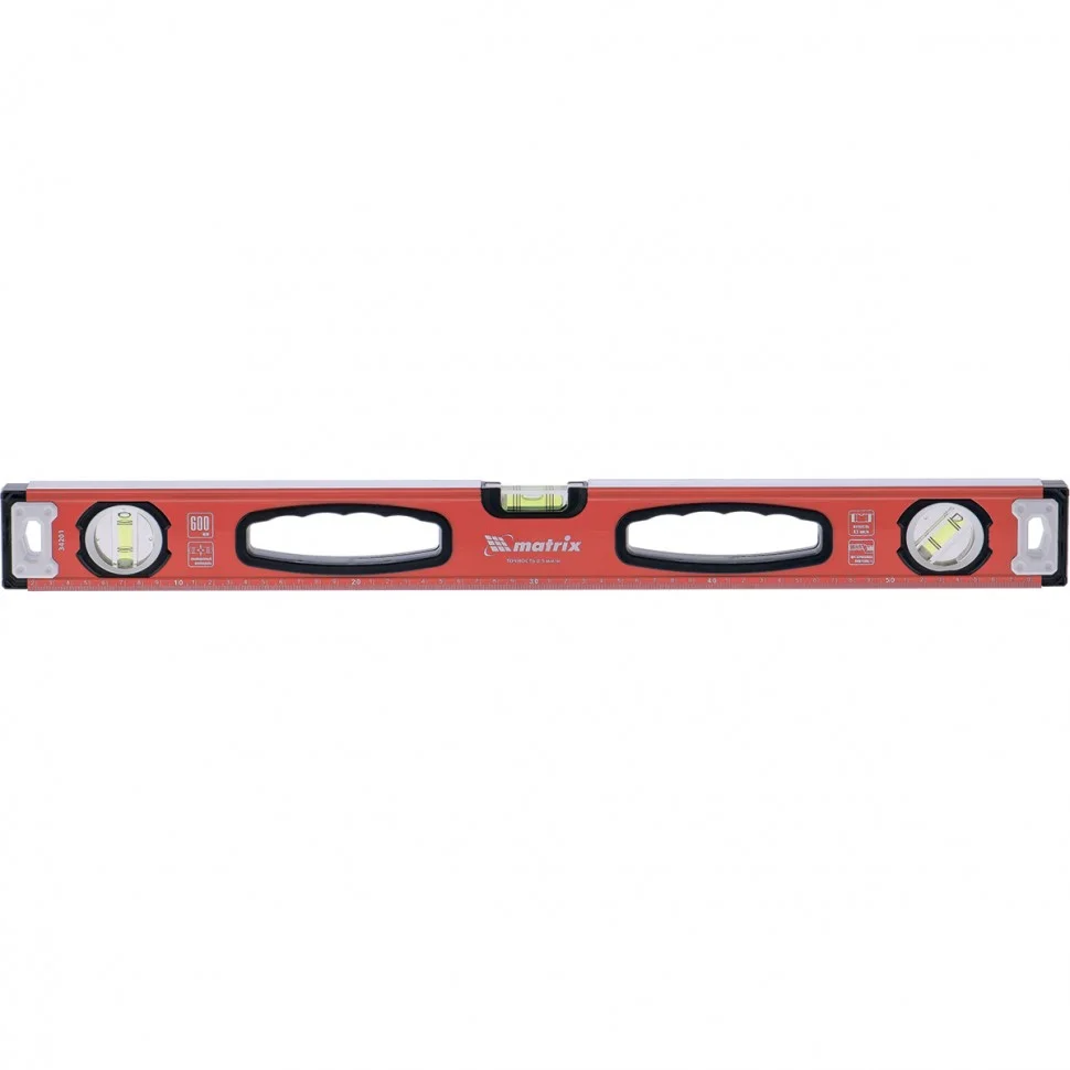 Алюминиевый фрезерованный уровень Matrix 34201 длиной 600 мм, с 3 глазками и рукоятками, позволяет найти отклонения от вертикали и горизонтали, а также выставить диагональ. Инструмент найдет широкое применение на строительной площадке, при выполнении ремонтных и монтажных работ.Для определения отклонения вертикали 90 градусов необходимо использовать пузырьковую ампулу только в верхнем положении уровня. Только базовая поверхность является рабочей (противоположная ампуле 180 градусов).ПреимуществаАлюминиевый профиль и колбы, установленные под электронным контролем, гарантируют надежность и прочность уровня.Фрезерованная рабочая поверхность снижает погрешность измерений.Уровень имеет эргономичные отверстия для комфортной эксплуатации.На корпус нанесена шкала, поэтому его можно использовать в качестве линейки.