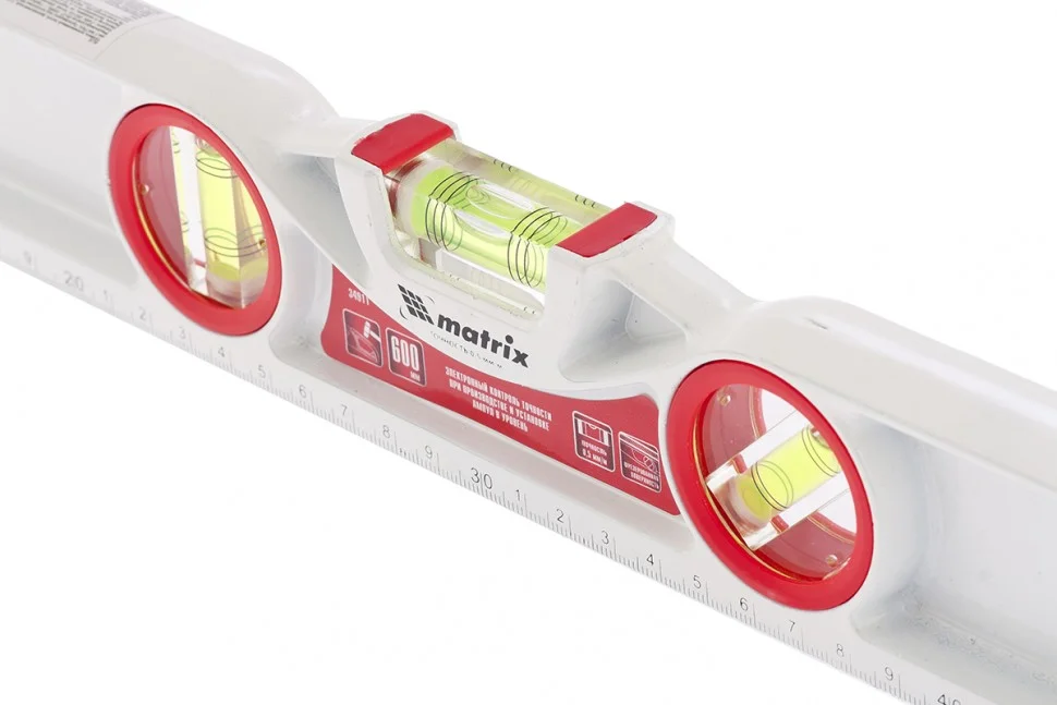 Алюминиевый литой уровень Matrix 34911 длиной 600 мм, фрезерованный, с 3 глазками и двумя ударными площадками, предназначен для проверки поверхностей на отклонение от горизонтали, вертикали и угла 45 градусов. Инструмент значительно повышает точность проводимых работ, пригодится частным мастерам и профессионалам на стройплощадке, при выполнении ремонта и монтаже различных конструкций.Для определения отклонения вертикали 90 градусов необходимо использовать пузырьковую ампулу только в верхнем положении уровня. Только базовая поверхность является рабочей (противоположная ампуле 180 градусов).ПреимуществаУровень изготовлен из прочного и коррозионностойкого алюминиевого профиля.Контроль при установке пузырьковых ампул осуществлен электронным методом, это повышает надежность устройства.Фрезерованная нижняя грань позволяет снизить погрешность до 0,5 мм/м.Две ударные площадки делают возможным дополнительное выравнивание материалов с помощью небольшой резиновой киянки.На корпусе уровня имеется шкала для проведения линейных замеров.