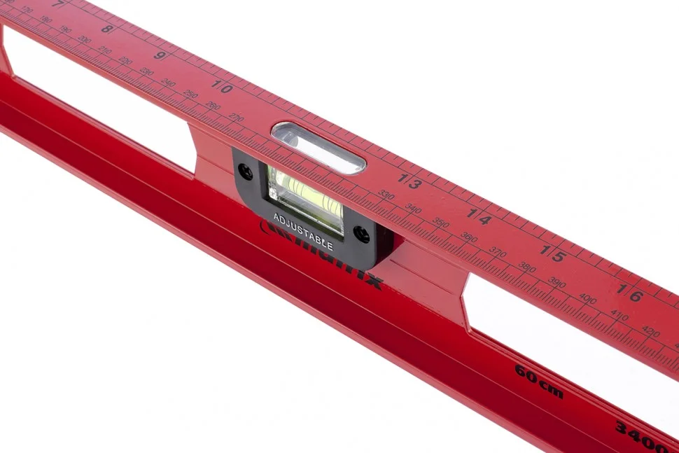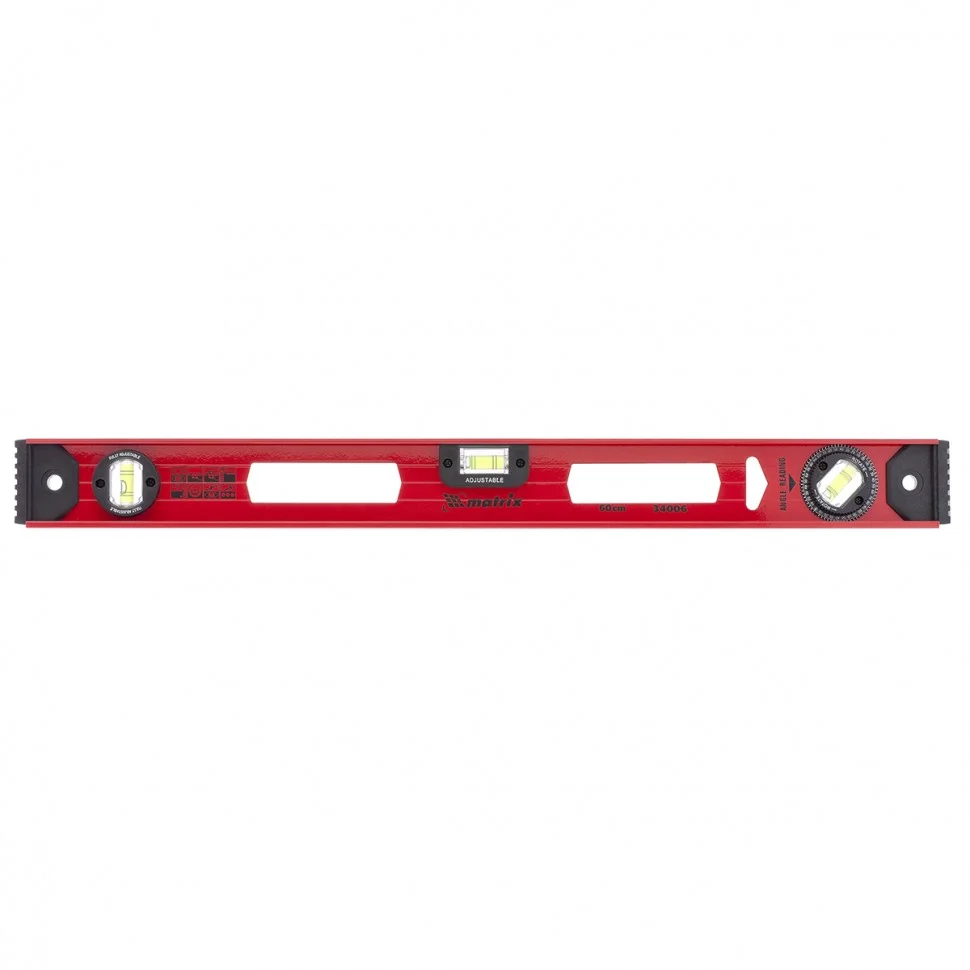 Усиленный алюминиевый уровень Matrix «Рельс» 34010 длиной 1000 мм снабжен 3 глазками для проверки поверхностей относительно горизонтальной и вертикальной плоскостей. Поворотный глазок уровня позволяет выстроить угол 45 градусов. Инструмент поможет выдержать все плоскости идеально ровными, поэтому пригодится строителям, отделочникам, бетонщикам и другим специалистам.Для определения отклонения вертикали 90 градусов необходимо использовать пузырьковую ампулу только в верхнем положении уровня. Только базовая поверхность является рабочей (противоположная ампуле 180 градусов).ПреимуществаДвутавровый алюминиевый профиль обеспечивает конструкционную прочность и жесткость инструмента.Подошва V-образной формы позволяет закрепить уровень на трубе для проведения сантехнических работ.Инструмент имеет фрезерованную подошву, это снижает погрешность измерений до 1 мм/м (0,057 градуса).