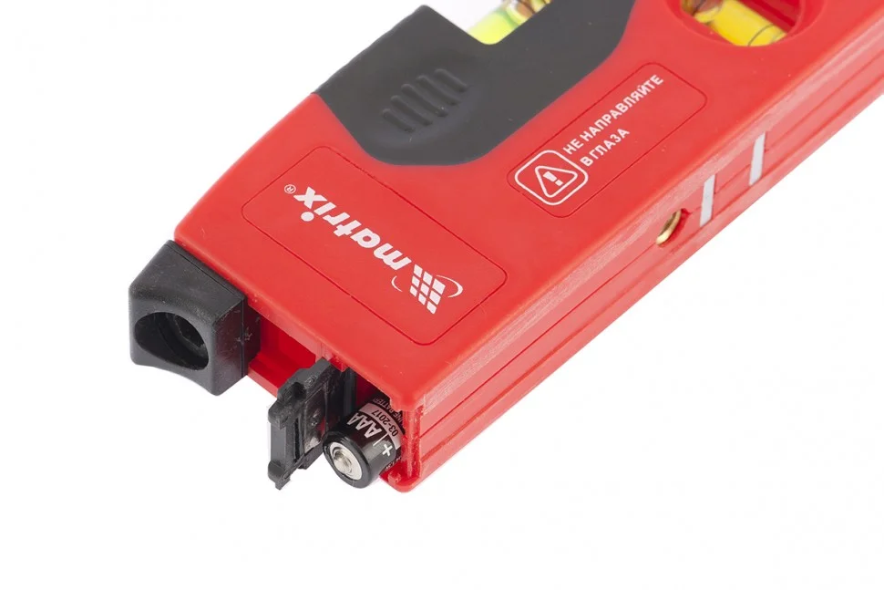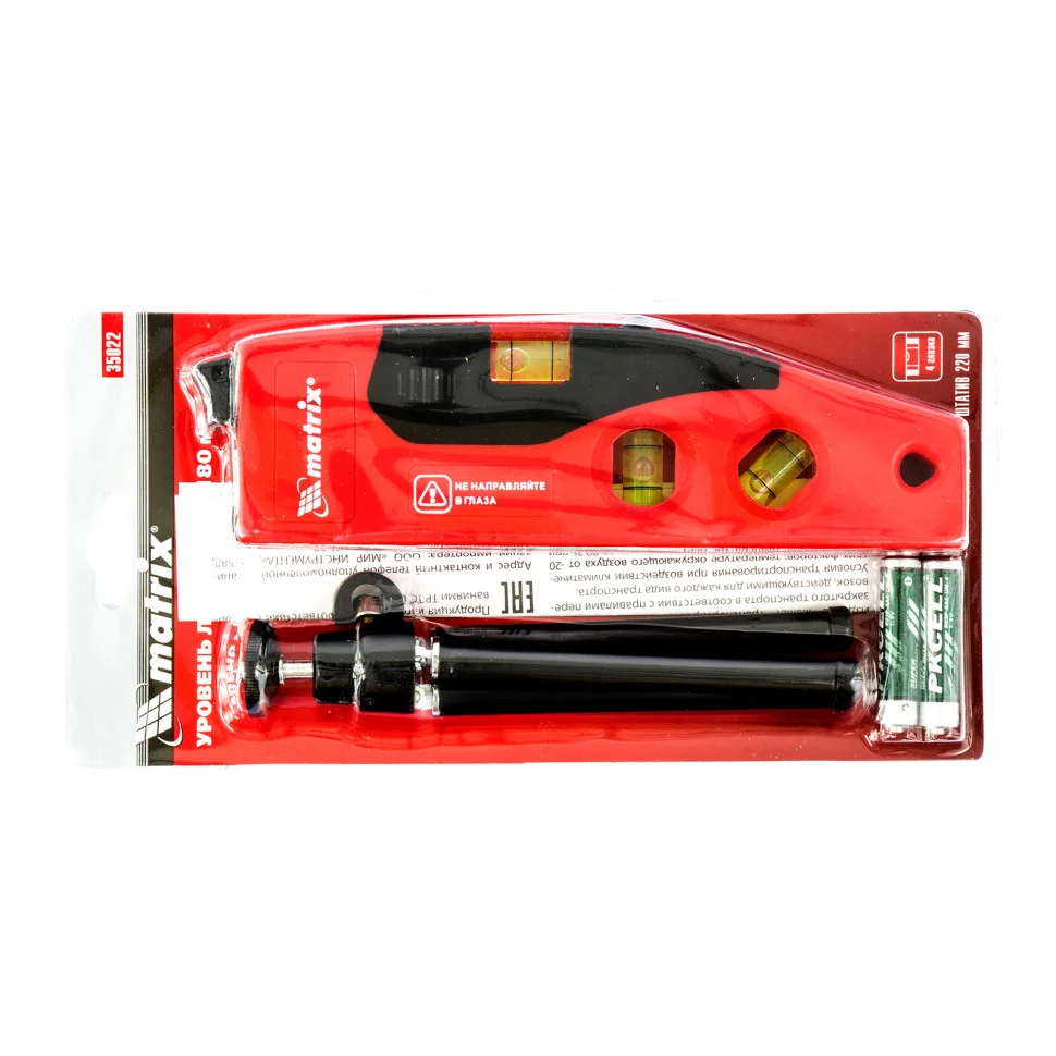 Лазерный уровень Matrix 35022 длиной 180 мм, с 4 глазками и штативом 220 мм, используется для построения разметки во время ремонта и строительства. Позволяет с точностью выполнить установку подвесной мебели, монтаж розеток, выключателей и электроприборов, укладку облицовочной плитки на пол и стены. Красный цвет луча будет виден при любом освещении, поэтому уровень хорошо работает как в помещениях, так и на открытом воздухе. Дальность проецирования составляет 10 м.ПреимуществаУдобное использование — уровень комплектуется штативом, рассчитанным на длину до 22 см, поэтому работать можно без помощников.Устойчивость — диаметр ножек штатива 9 мм обеспечивает прочное положение на разных поверхностях.Точная разметка — в корпус встроены 4 глазка: вертикальный, горизонтальный, круговой и наклонный (45°) для максимально качественного выполнения работ.2 батарейки типа ААА в комплекте — начать работу можно сразу после покупки.Магнитное крепление — лазерный уровень удобно зафиксировать на металлических поверхностях.Мобильность — небольшие габариты (24 х 12,7 х 3 см) и малый вес 213 г упрощают использование и транспортировку уровня.